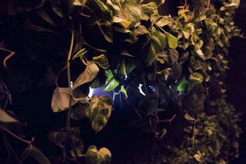 Das gesamte Konzept erfordert keine mechanische Kühlung. Auf innovativen, zu 100% aus recyceltem Material bestehenden Akustikabsorbern wachsen Pflanzen, was die akustischen Eigenschaften des Raumes verändert. Die Trockennebelventilatoren sorgen für Luftbewegung und Verdunstungskühlung, die Lufttemperatur sinkt und gleichzeitig steigt die Luftfeuchtigkeit. Es ist ein kniffliger Balanceakt, Umgebung, Material und Licht durch passive Systeme so zu beeinflussen, dass die menschliche Empfindung ausgetrickst wird und dieser Wahrnehmungsraum entsteht, der es erlaubt, die Ausstellung einige Augenblicke lang gefühlt zu verlassen.