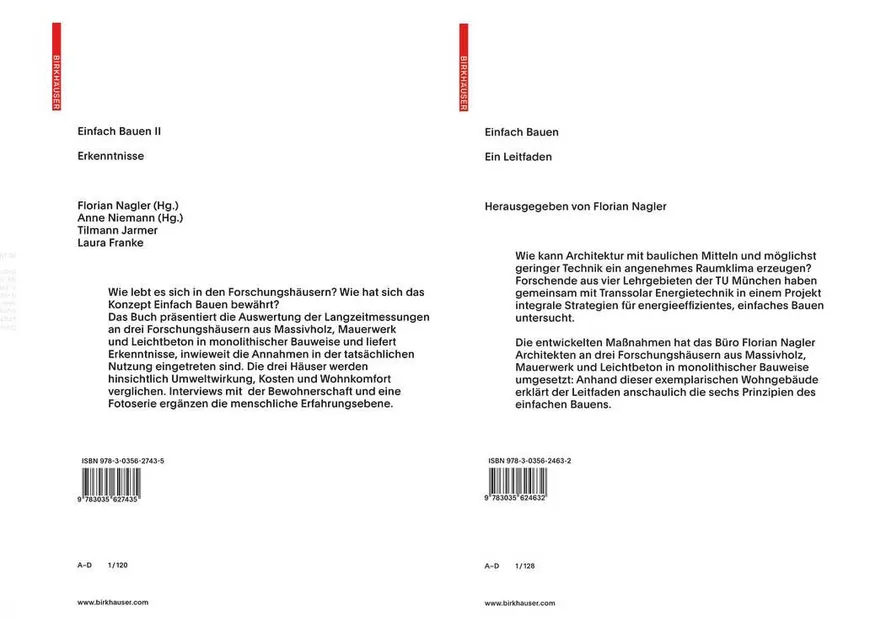 Wie kann Architektur mit baulichen Mitteln und möglichst geringer Technik ein angenehmes Raumklima erzeugen? Forschende aus vier Lehrgebieten der TU München haben gemeinsam mit Transsolar Energietechnik in einem Projekt integrale Strategien für energieeffizientes, einfaches Bauen untersucht. Die entwickelten Maßnahmen konnte das Büro Florian Nagler Architekten an drei Forschungshäusern aus Massivholz, Mauerwerk und Leichtbeton in monolithischer Bauweise umsetzen: Anhand dieser exemplarischen Wohngebäude erklärt der Leitfaden anschaulich die sechs Prinzipien des einfachen Bauens.