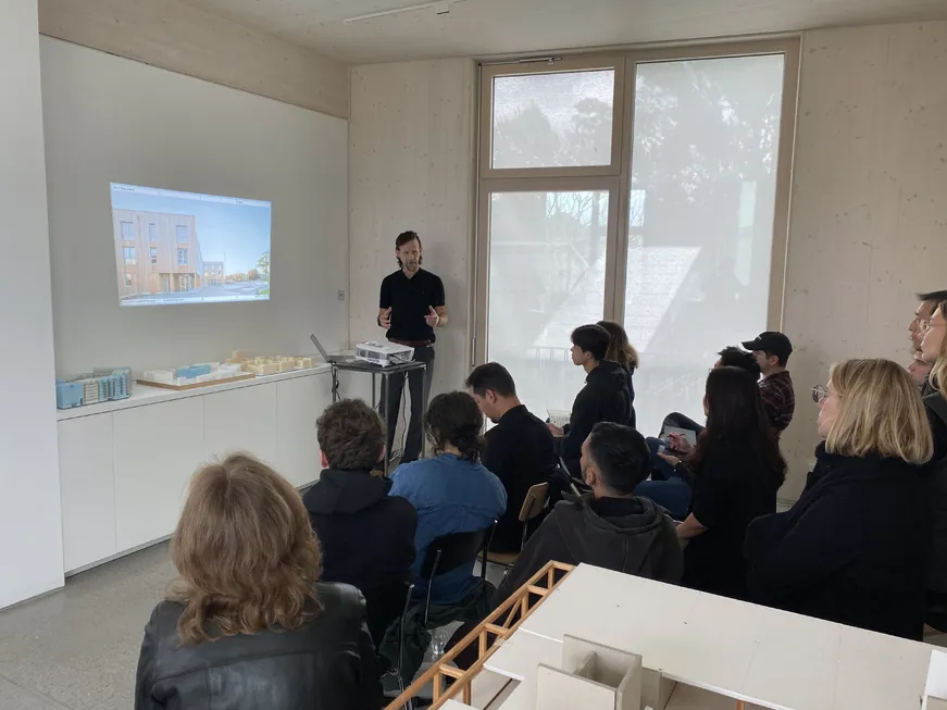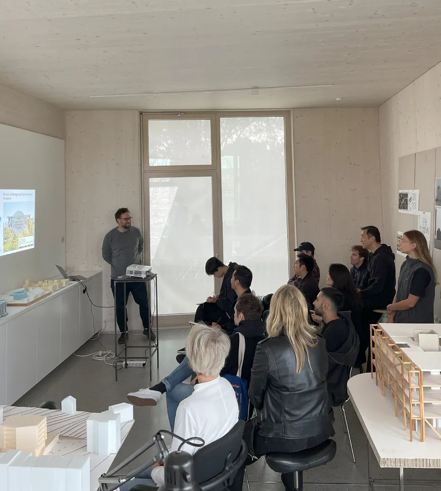 So ließ es sich Felix Thumm nicht nehmen, für sie einen Vortrag über Climate Responsive Design zu halten. Ermöglicht haben dies Lager Schwertfeger in ihrem Berliner Büro. Und die Studierenden erhielten noch zusätzlich vom Architekten Markus Lager Informationen über Holzbauweise.