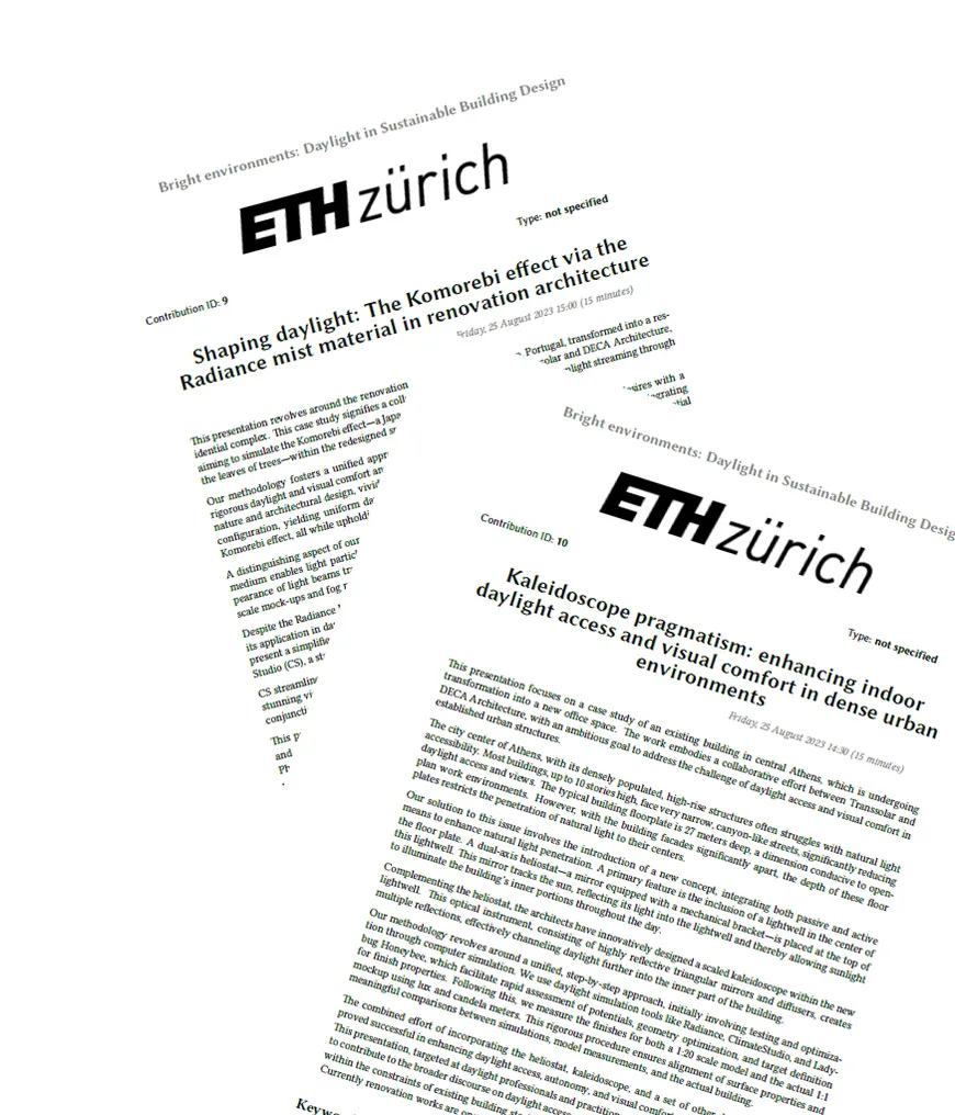 August 25th Alberto Bruno and Daniel Lago attended the “Bright environments: Daylight in Sustainable Building Design Conference at ETH Zürich”, where they presented the topics “Kaleidoscope pragmatism: enhancing indoor daylight access and visual comfort in dense urban environments” and “Shaping daylight: The Komorebi effect via the Radiance mist material in renovation architecture” Both presentation showcasing our findings from two projects in collaboration with DECA Architecture. Matthias Schuler is co-author in both presentations.