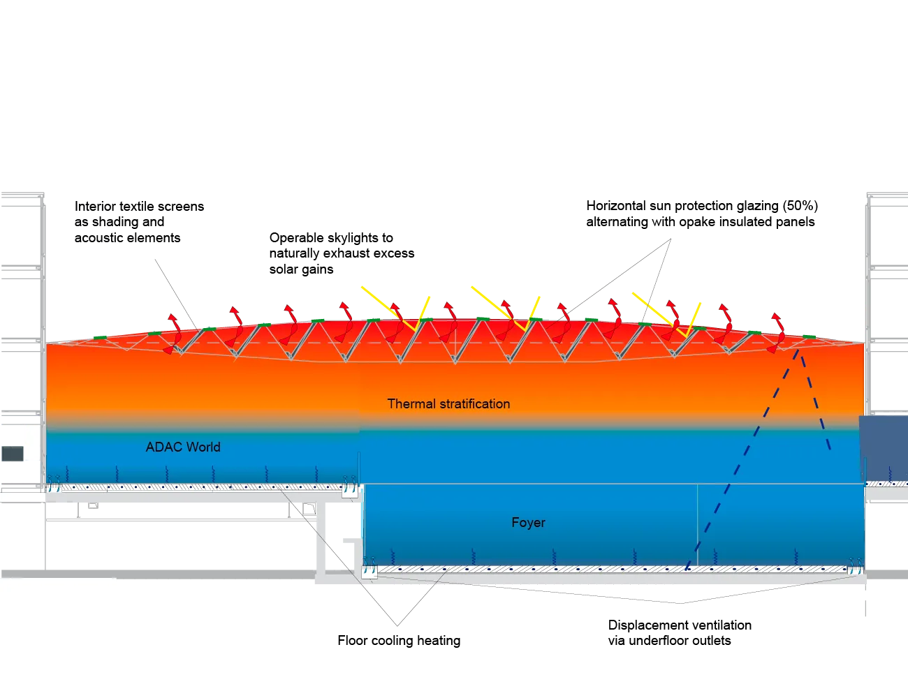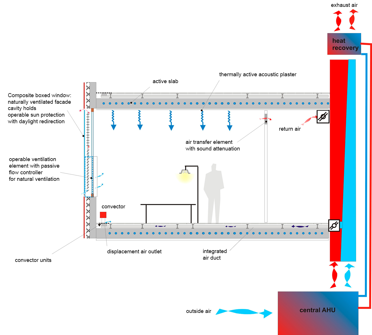 Die Fassade besitzt manuell bedienbare Öffnungsflügel, die mit einem vorgelagerten Volumenstrombegrenzer für die natürliche Belüftung ausgestattet sind. Dies reguliert passiv die in den Raum strömende Zuluftmenge und macht nahezu unabhängig vom Überdruck an der Fassade. Die Elemente erlauben in dem offenen Bürokonzept auch an windigen Tagen eine individuelle natürliche Lüftung, ohne Gefahr von Zugerscheinungen oder erhöhten Wärmeverlusten. An ruhigen Tagen öffnen die Elemente passiv.