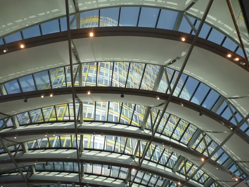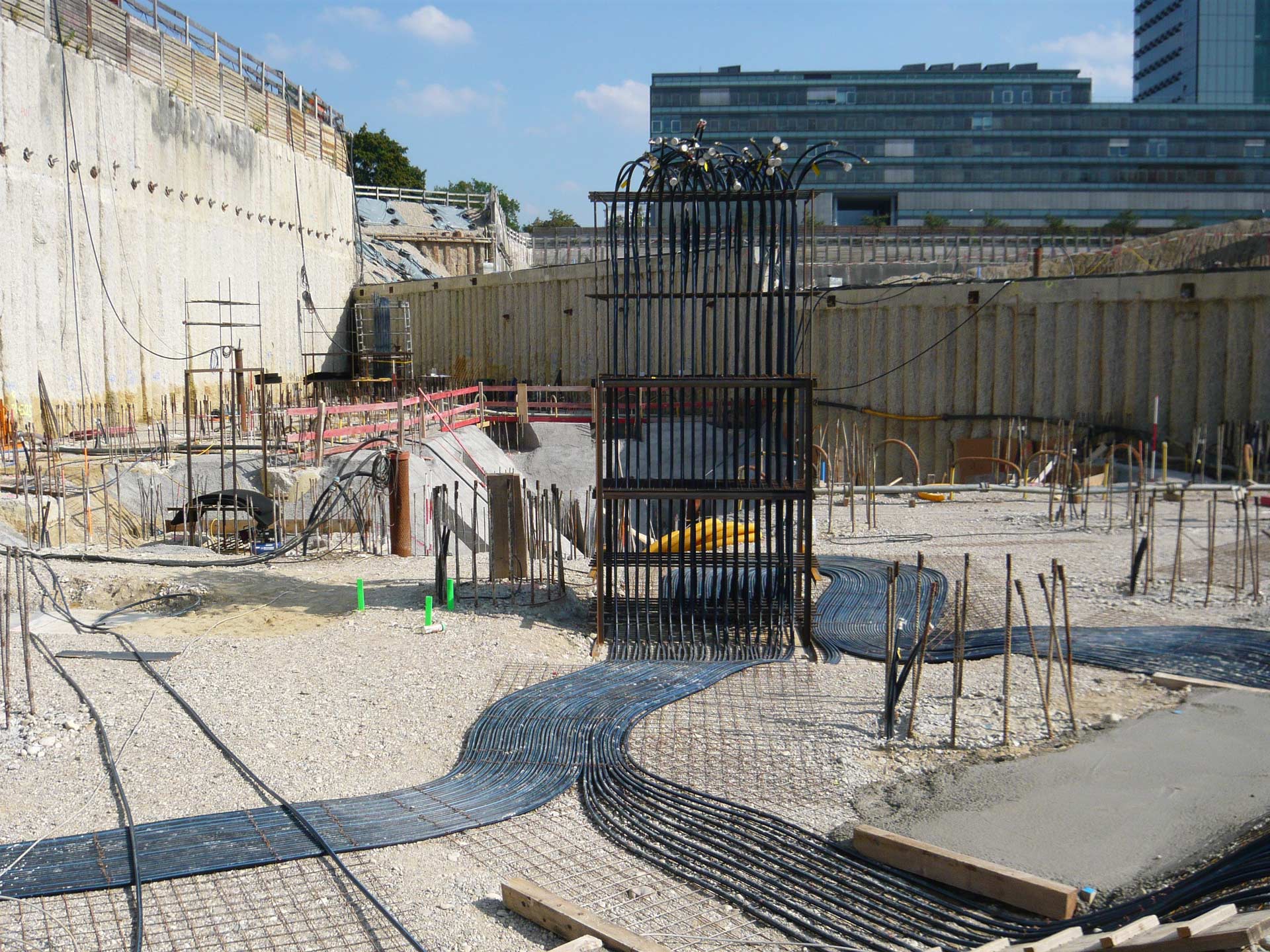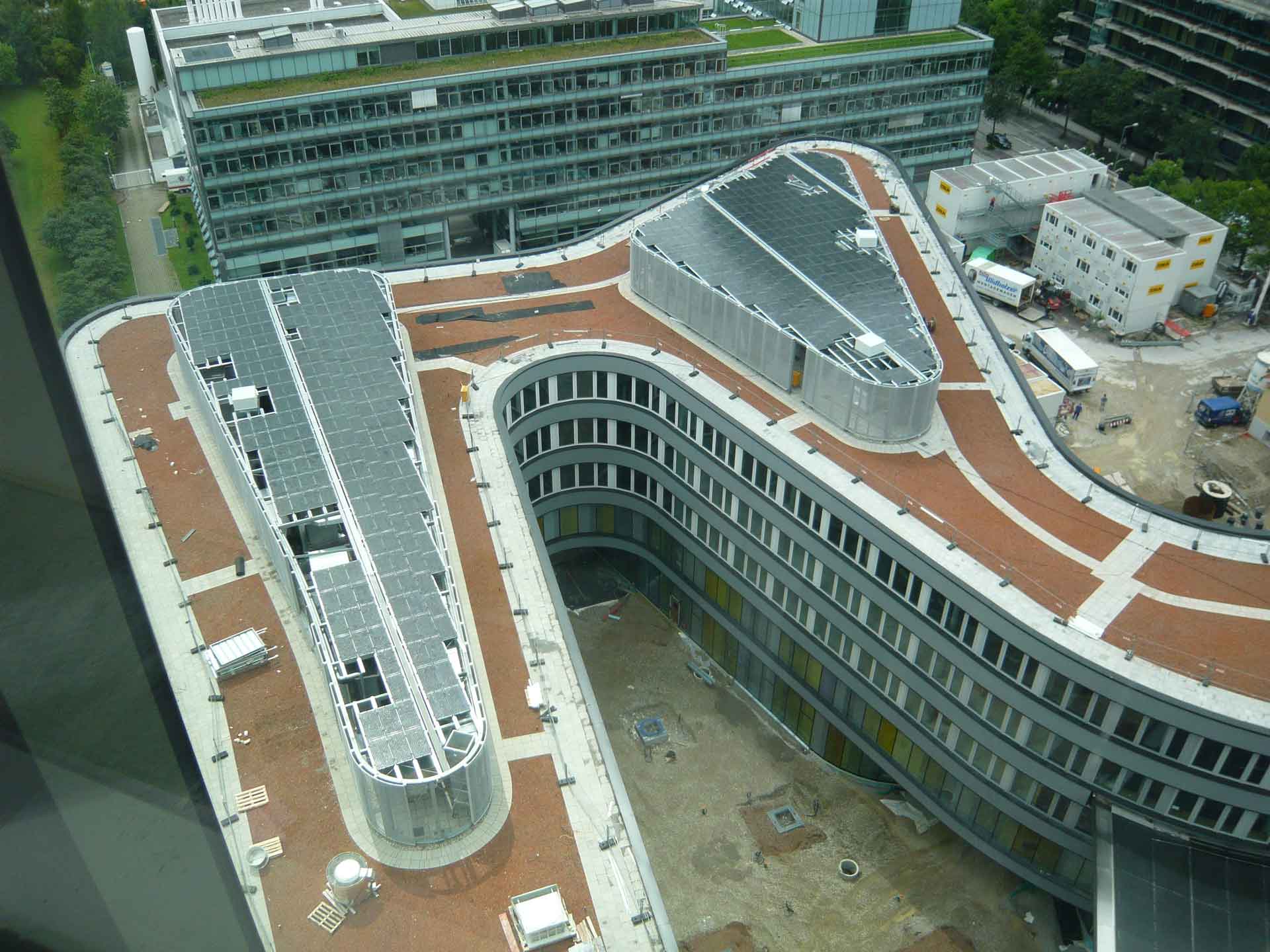 Thermisch aktivierte Massivbetondecken temperieren Hochhaus und Flachbau. Eine mechanische Belüftung mit integrierter Wärmerückgewinnung versorgt die gesamte Bürofläche über Quellluftauslässe mit Frischluft. Das stellt auch in besonders kalten oder heißen Perioden eine optimale Luftqualität sicher. Die Geschossdecken werden im Sommer bevorzugt frei über das Geothermiesystem gekühlt, das aus aktivierten Gründungspfählen des Hochhauses, dem Sicherungsbauwerk der U-Bahn und der Baugrubenumschließung besteht oder über Rückkühlwerke. Alternativ kann über elektrische Kompressionskältemaschinen mechanisch gekühlt werden. Geheizt wird mit Fernwärme sowie bereichsweise über Wärmepumpen aus dem Geothermiesystem. Die Dächer des Flachbaus tragen Photovoltaikmodule mit 200 kWp Nennleistung.