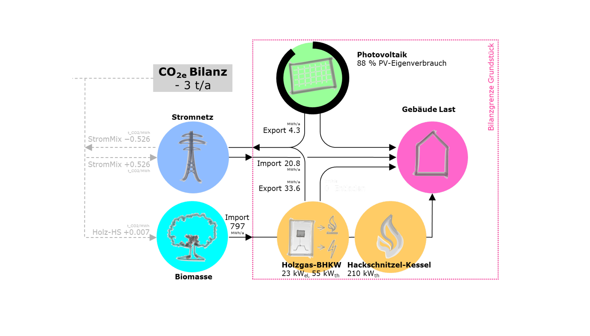 Transsolar hat sich darum gekümmert: Restholz aus dem eigenen, 100 ha großen Wald in Form von Hackschnitzeln wird als Quelle erneuerbarer Energie verwendet. Um einen (Primär) Energieüberschuss zu erzeugen, wird einerseits die Biomasse in einem Holzvergaser-Gasmotor-BHKW nicht nur in Wärme (55 kW), sondern auch in Strom (20 kW) umgewandelt. Zusätzlich erzeugt eine PV-Anlage (40 kWp) auf dem Dach der Energiezentrale solaren Strom. Überschüssiger Strom lädt dabei zuerst einen Speicher vor Ort auf (40 kWh LiFePO4) zur Optimierung des Eigenstrom-Verbrauchs und steht auch einer Stromtankstelle für E-Mobility zur Verfügung, bevor er weiter in das öffentliche Stromnetz geleitet wird als „Einspeisung“.