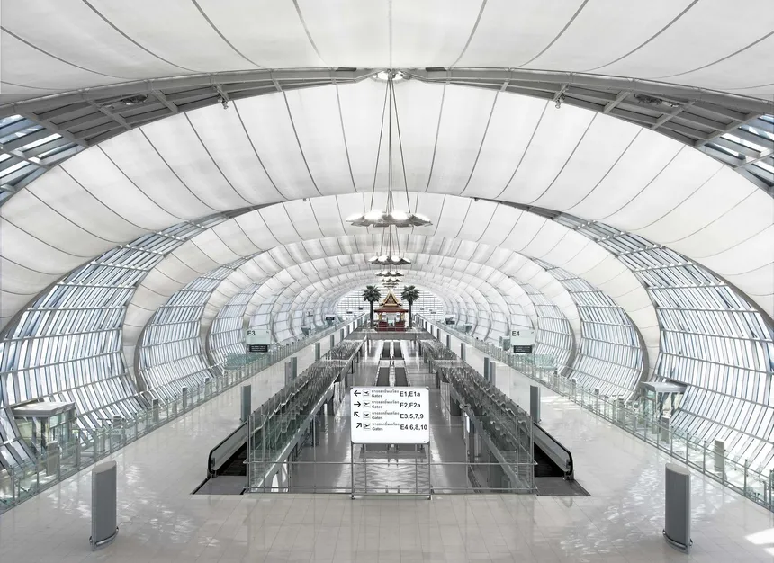 Das Klima in Bangkok weist Temperaturen zwischen 25 °C und 35 °C bei konstant hohen relativen Luftfeuchtigkeiten auf und zwingt zur dauerhaften Kühlung und Entfeuchtung eines internationalen Flughafengebäudes. Die Gebäudehülle muss daher solare Lasten möglichst effizient minimieren. Ein großer Dachüberstand verschattet die Fassaden des Terminalgebäudes, gleichzeitig ist das Dach selbst nicht vollständig opak, sondern die großen Lamellen ermöglichen durch ihre Anordnung den Einfall diffusen Lichts, halten aber unerwünschte direkte Solarstrahlung ab. Die Zonierung in unkonditionierte Lufträume, die keine Aufenthaltszonen beinhalten und gekühlte Bereiche verringert die benötigte Kühlleistung. Eine Fußbodenkühlung führt auftreffende solare Strahlung direkt aus dem Raum ab, zusätzlich bringt ein Quellluftsystem gekühlte Luft mit geringer Geschwindigkeit bodennah in die Räume ein. Die Hülle der über 3,5 km langen Concourses besteht aus zwei verschiedenen Materialien die sich abwechseln: transparente Glasflächen zur Durchsicht vorwiegend im Wandbereich und transluzente Membranflächen zur Raumausleuchtung im Dach. Neben der Belichtung bietet dieses Membranpaket auch Schallschutz. Zwischen der wetterseitigen Membran aus Teflon beschichtetem Glasfasergewebe und der inneren perforierten Membran ist eine Schicht transparenter Schallabsorber eingebaut, die Schall von außen (Fluglärm) abhält und von innen absorbiert (Raumakustik).