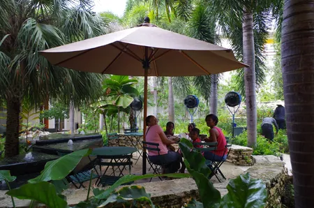 Verdunstungsventilatoren sind nichts Neues, aber die Ventilatoren, die in der Camana Bay und im Kimption Seafire Resort and Spa, einem Luxusresort am Strand, getestet wurden, sind anders: es sind Dry Mist-Ventilatoren. Die Kombination der Wörter "Dry" und "Mist" mag wie ein Widerspruch in sich wirken, aber die verwendete Technologie erzeugt einen Nebel, der sich trocken anfühlt. Wasser wird mit hohem Druck durch eine Düse mit einer sehr kleinen Öffnung gepresst. Der entstehende Nebel ist so fein, dass er schon kurz nach dem Austritt aus dem Gebläse verdunstet und sich aus einer Entfernung von bis zu einem Meter trocken anfühlt. Der Verdunstungsprozess senkt die Temperatur vor den Ventilatoren mit viel weniger Energie als die herkömmliche Luftkühlungstechnik.