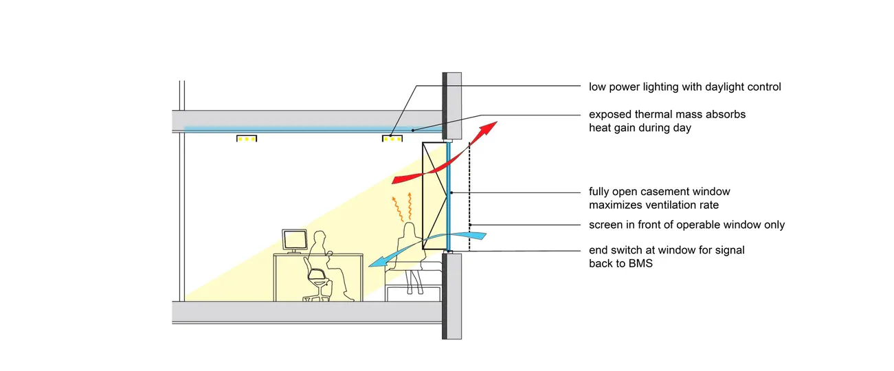 Das gesamte Klimakonzept dreht sich um das Wohnerlebnis der Studenten. Das einzigartige, fest montierte Aussenrollo hat diverse Funktionen: es ist Sonnen- und Fallschutz und dient gleichzeitig zur Maximierung der natürlichen Belüftungsrate. Dies ermöglicht hohe Behaglichkeit bei geringem Energieverbrauch. Hierbei bietet die aktivierte Geschossdecke Wärme und Kühlung wobei die Luftqualität durch minimale Lüftung sichergestellt wird. An einem Drittel des Jahres wird über die Fenster natürlich gelüftet.