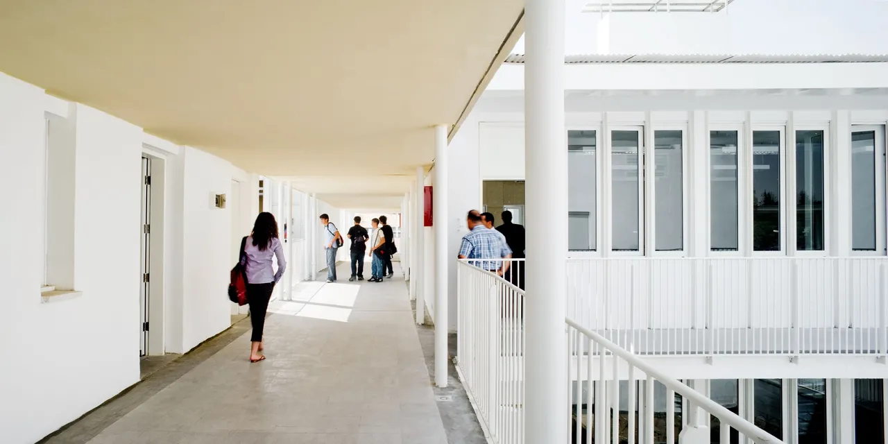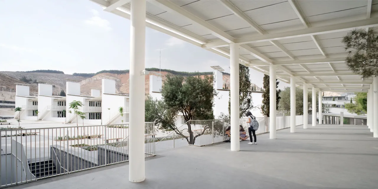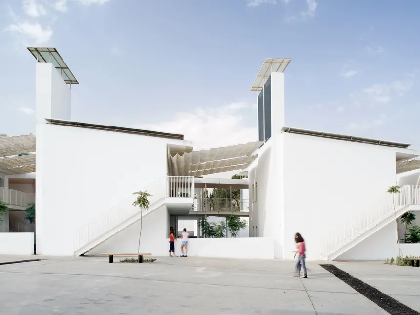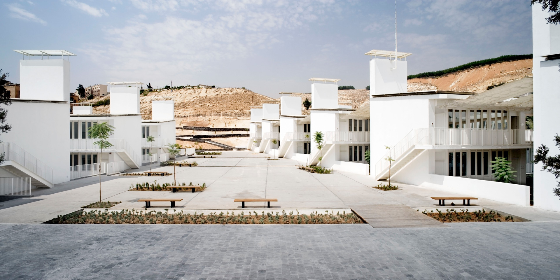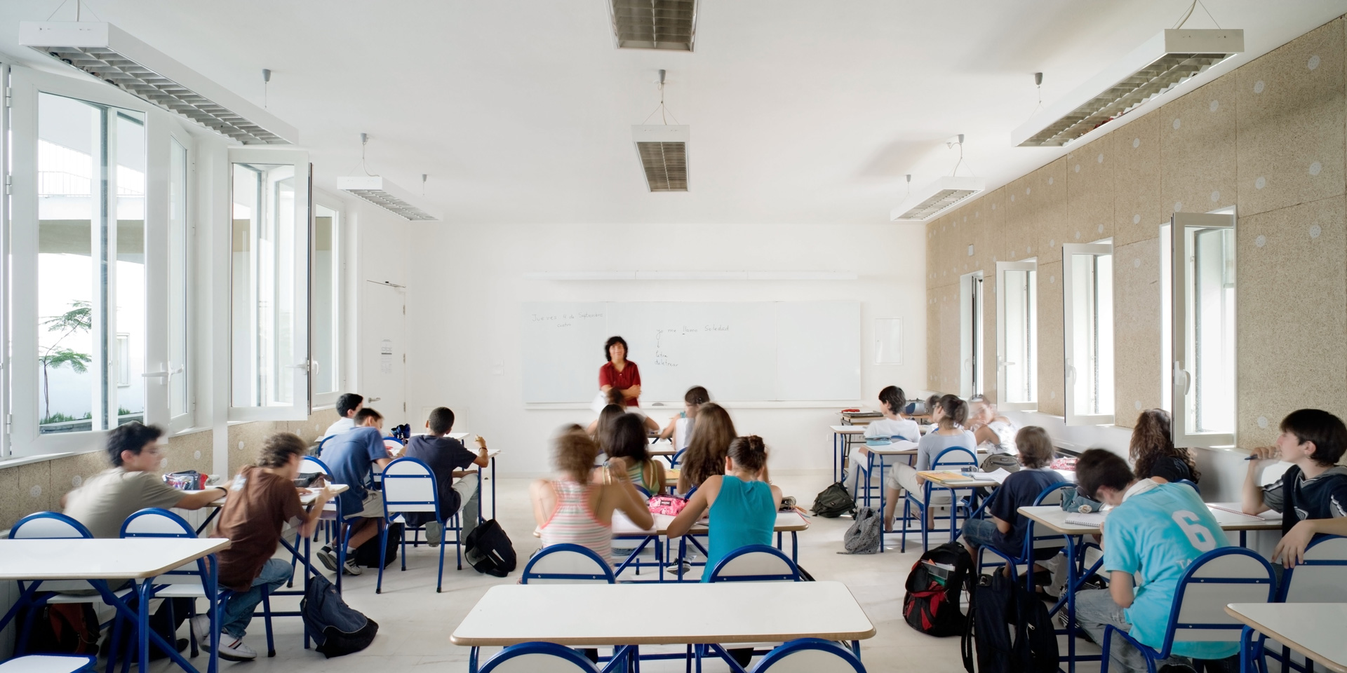 Zur Belüftung der Klassenräume wurden windunterstützte Solarkamine für die Querdurchlüftung der Klassenräume entwickelt und mit einer Kombination aus lokalen Materialien und Polycarbonatplatten als Sonnenfalle im Sinne einer Low-Budget-Lösung umgesetzt. Da Syrien durch ein Wüstenklima gekennzeichnet ist - heiße Tage und kühle Nächte - wird die Zuluft des Tages aus den verschatteten Mikroklimas der Innenhöfe über Erdkanäle vorkonditioniert und anschließend den Klassenräumen als Frischluft zugeführt. Angetrieben wird das System über die Solarkamine.