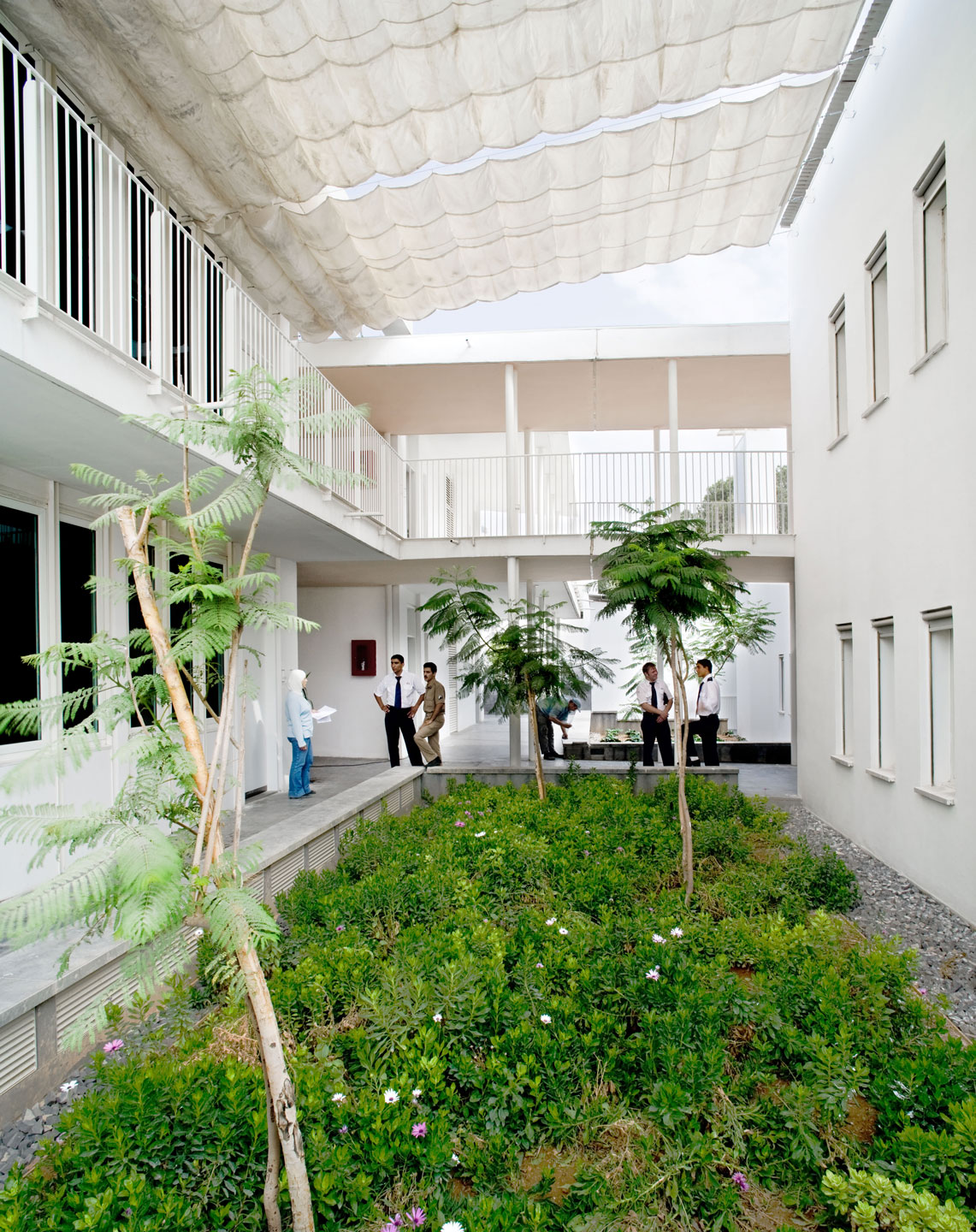 Ein Verschattungselement oberhalb der Innenhöfe bietet an Sommertagen Schutz vor Sonneneinstrahlung; es wird nachts zur Abkühlung der Höfe geöffnet. Im Winter wird das Prinzip umgekehrt, um tagsüber die Wärme der Sonneneinstrahlung zu nutzen und diese während der Nacht nicht an den klaren Himmel zu verlieren.