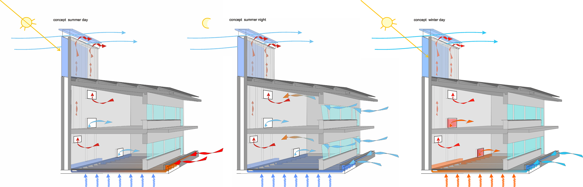 Während der Nachtstunden wird über die kühle Außenluft die in die Erdkanäle und in der Gebäudemasse gespeicherte Wärme des Tags zeitversetzt abgebaut. Durch diesen Ansatz konnte vollständig auf eine Klimatisierung verzichtet werden.