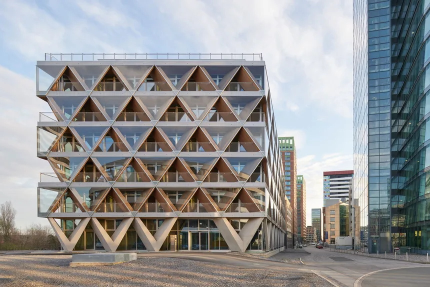Mit seiner rautenförmigen Fassadenstruktur hat das Gebäude ein charakteristisches Erscheinungsbild. Diese gestaltprägenden Elemente wurden bereits in der Wettbewerbsphase zusammen mit den Architekten und Tragwerksplanern entwickelt. Die markanten Stützen aus Brettschichtholz, geschützt von Prallscheiben, sind Elemente des Tragwerks. Zugleich wirken sie als Sonnenschutz und sind daher je nach Himmelsrichtung gezielt in unterschiedlichen Tiefen ausgeführt. Die tragende Fassade erlaubt offene, stützenfreie Grundrisse für besonders flexible Nutzung- und Aufteilung. Außerdem ermöglicht diese Art von feststehendem Sonnenschutz, auf einen weiteren außen liegenden zu verzichten. Der Nachweis des sommerlichen Sonnenschutzes war allerdings mit den üblichen statischen Berechnungsmethoden nicht zu erbringen, hierzu waren detaillierte Simulationsrechnungen erforderlich.