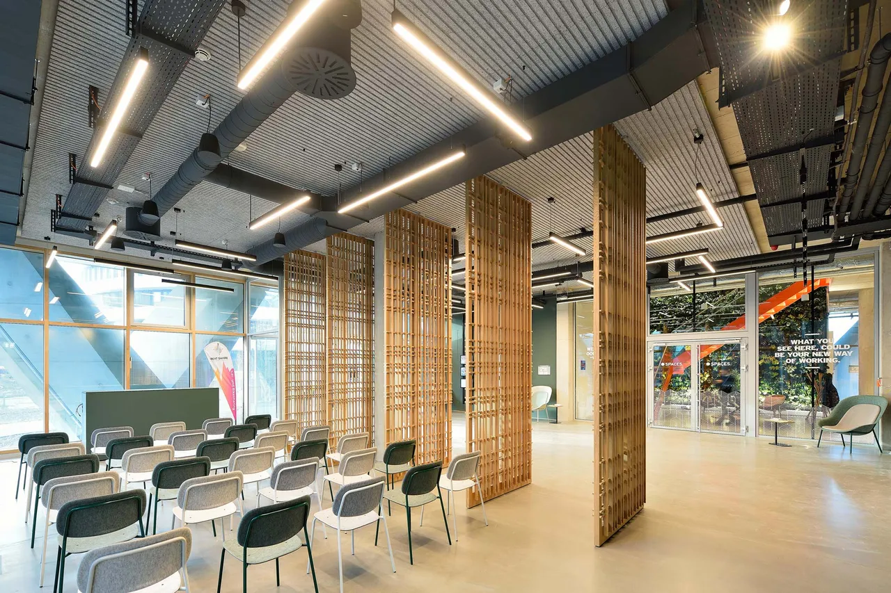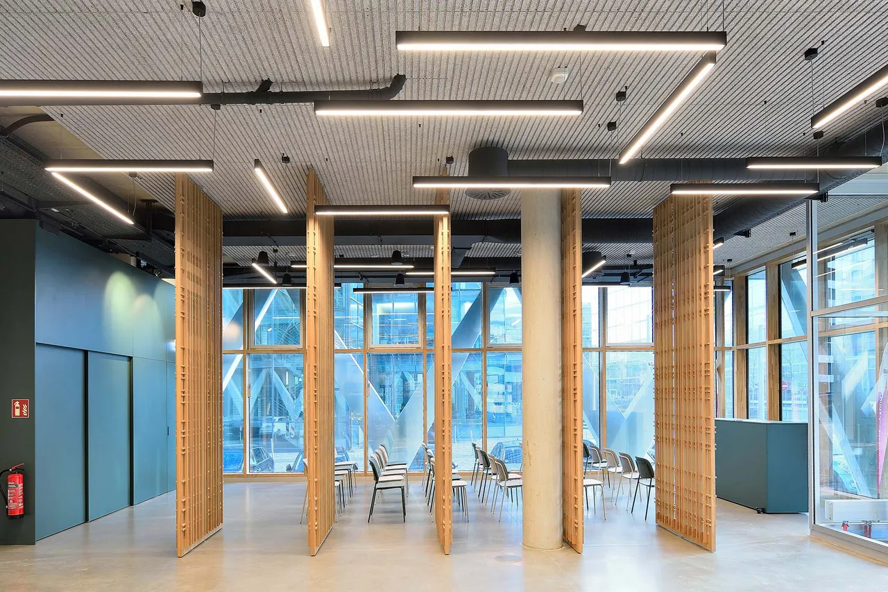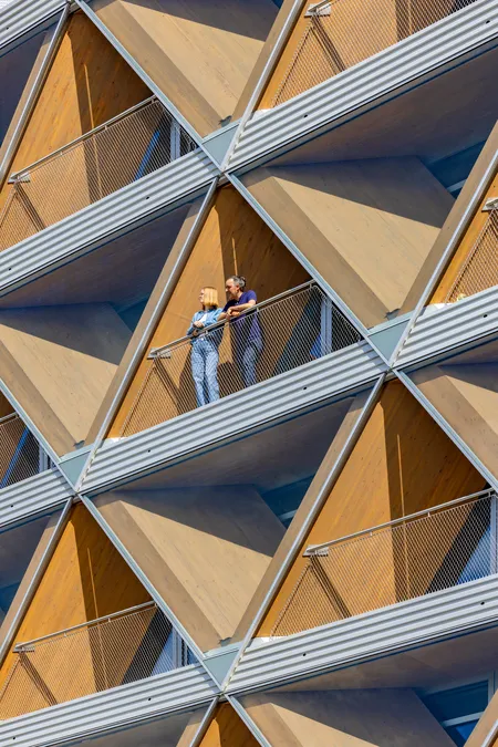 Das innovative Holztragwerk entstand in integraler Zusammenarbeit. Bereits für den Konzeptwettbewerb 2017 hatte das Team Grundlagen für den energieeffizienten Entwurf gesichert und über Simulationen nachgewiesen, dass das Gebäude funktionieren kann. Die Fassadengeometrie erlaubt optimalen Licht- und Wärmeeintrag ins Gebäude, kombiniert Offenheit und Geschlossenheit und bietet geschützte Bereiche, die sich in Richtung Hafenbecken und Vorplatz als Loggien nutzen lassen und zugleich auch in der Nacht eine natürliche Lüftung sicher möglich machen.