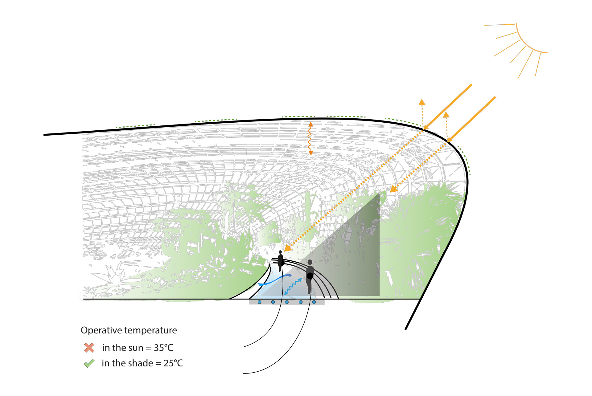 Neben großen Gartenanlagen bietet "Gardens by the Bay" den Besuchern mit zwei riesigen, gekühlten Gewächshäusern eine Attraktion von Weltklasse. Der „Flower Dome“ präsentiert das kühl-trockene Klima des Mittelmeerraums und der semi-ariden, subtropischen Regionen. Im „Nebelwald“ lässt sich das kühl-feuchte Klima der tropischen Bergregion erleben. Transsolar erarbeitete die Designvorgabe für den Kunden, fungierte als technischer Berater für die Gewächshäuser und erstellte die Klima- und Energiekonzepte für die „Garden Offices“ und das „Support Biome“. Das Konzept sieht vor, Räume zu schaffen, die sowohl ein angenehmes Klima für die Besucher bieten als auch ideale Wachstumsbedingungen für die ausgestellte Flora in den zwei Biome, die zugleich energieeffizient betrieben werden sollen. Zunächst wurden sechs Prototypen gebaut um verschiedene Klimastrategien zu entwickeln, zu testen und zu überwachen. Die Ergebnisse wurden für die Entwicklung der Designvorgaben und der Leistungsspezifikationen der großen Gewächshäuser genutzt. Die Konditionierung der Räume beruht sowohl auf passiven und aktiven Technologien. Die Optimierung der Gebäudehülle beinhaltete die Spezifikation von hochselektivem Sonnenschutzglas (g-Wert 0,35), die Nutzung der Bäume für die Verschattung und die natürliche Temperaturschichtung für klimatisch angenehme Besucher-Bereiche. Der hohe Tageslichtanteil (Tageslichttransmission 0,7) ermöglicht ideale Bedingungen für Wachstum und Blüte der Pflanzen. Die Raumkühlung erfolgt über den Fußboden, Frischluft wird auf Höhe des Besucherbereichs als Quellluft zugeführt. Der Kunde ist für alle Parks und damit für einige Millionen Bäume in Singapur verantwortlich und produziert dadurch viel Holzschnitt. Transsolar initiierte ein CO2-freies Energieversorgungskonzept, welches die gesamte Kühlung der Gewächshäuser durch die Nutzung dieser erneuerbaren Energiequelle deckt. Die Holzabfälle werden in einem Dampfkessel verbrannt und die Energie in einem mehrstufigen Prozess zur Stromerzeugung, Absorptionskühlung und Luftentfeuchtung mit flüssigen Sorbentien genutzt.