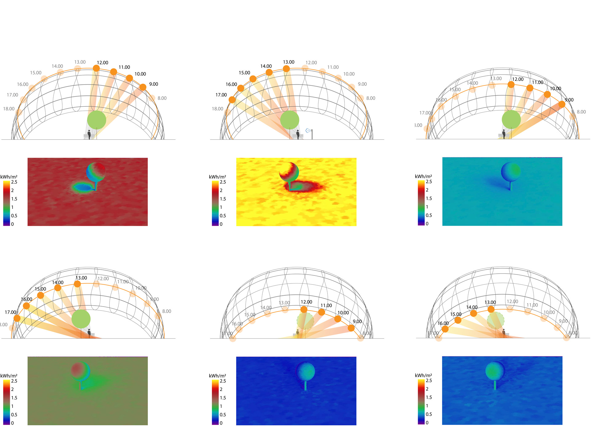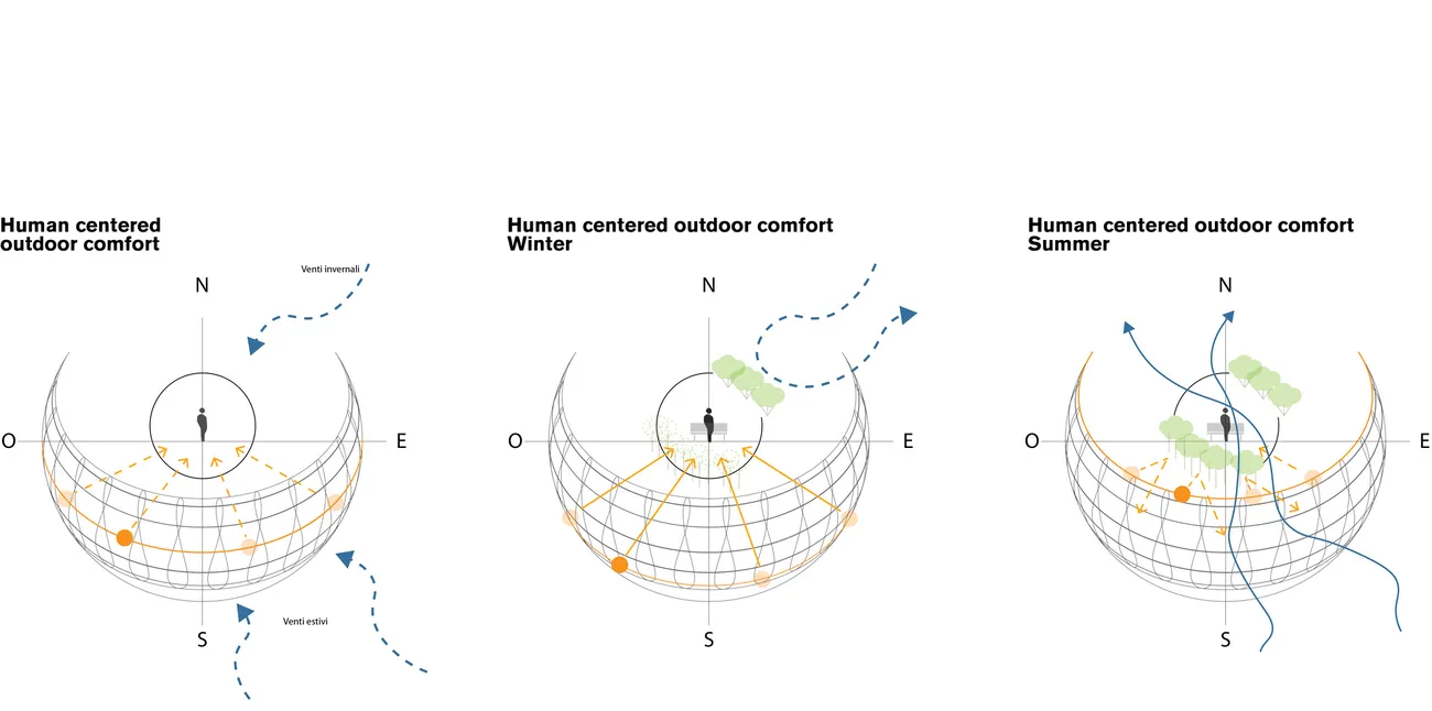 Was die Sonne während der heißesten Tage und Stunden abhält, darf die aus dem Süden und Südosten kommende Brise nicht blockieren. Hier eignet sich hochstämmige Vegetation, ideal für Sitz- und Rastplätze oder gar für andauernde Aktivitäten. Im Winter schafft Sonneneinstrahlung die Komfortzonen; daher müssen laubabwerfende Bäume gewählt werden. Die Kraft des Windes im Winter, muss begrenzt bleiben, daher braucht man auch grüne Barrieren von geringer Höhe aber hoher Dichte. Die Studien von Transsolar analysierten die Sonneneinstrahlung und erlaubten Rückschlüsse auf die Größe und Lage der Komfortzonen und Änderungen im Jahresverlauf.