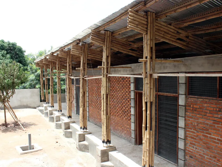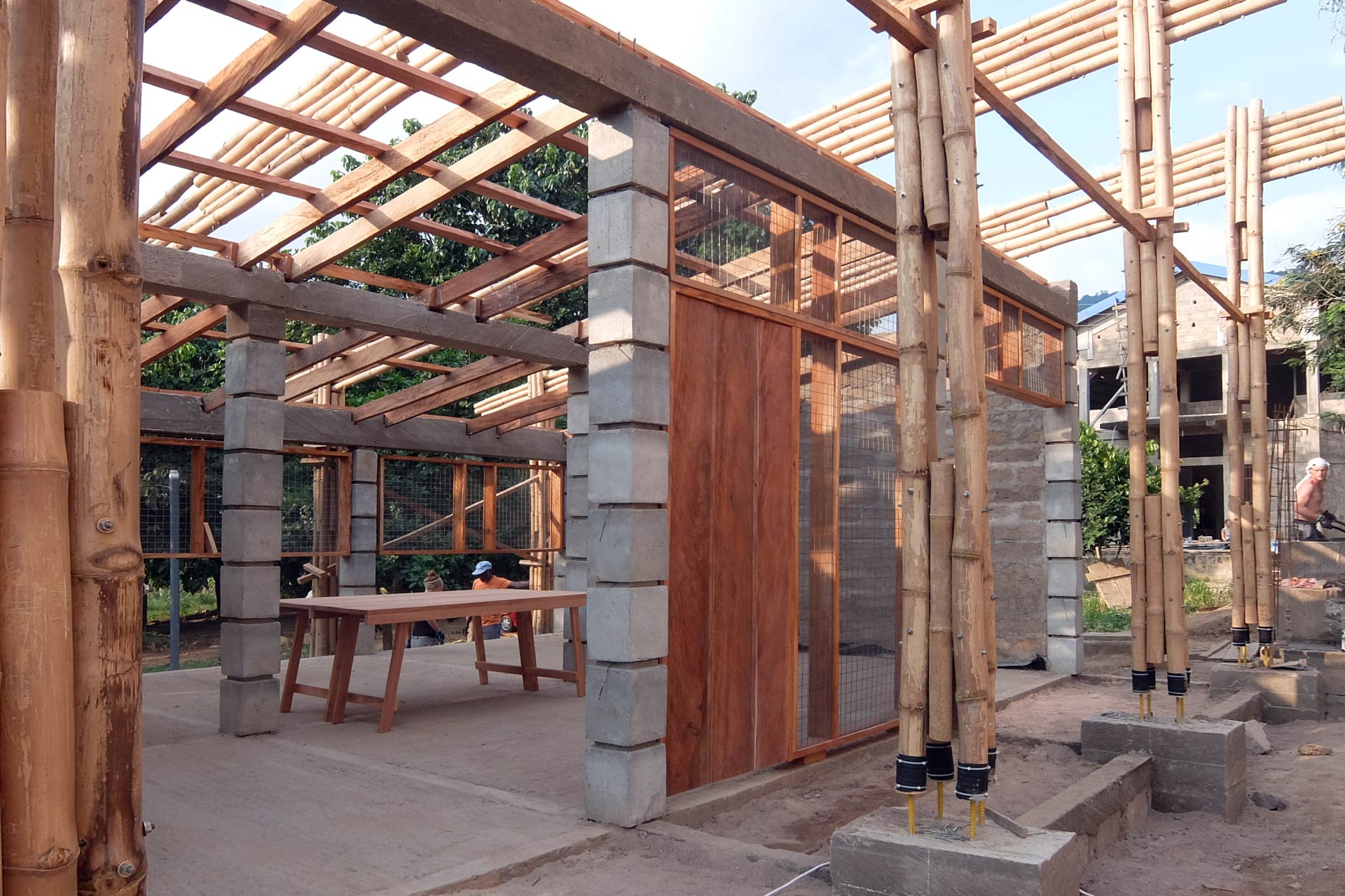Transsolar ist erfahren mit passiven Strategien, die auch bei warm-feuchten Klima wie dort in Westafrika dauerhaft funktionieren und für mehr Komfort sorgen und gibt das Wissen gerne weiter. Luftbewegung zu ermöglichen ist eine geeignete Strategie, die Schwüle und Hitze lindert. Daher sind die Gebäude möglichst zweigeschossig gebaut und mit großzügigen Lüftungsöffnungen versehen. Wind kann so durch die Gebäude strömen und nicht zuletzt nachts die «thermischen Massen« entwärmen, hier sind es Mudbricks aus Eigenproduktion, Ziegel einer lokalen Firma und etwas Beton. Die Hauptwindrichtung in Havé ist Nord-Süd. Daher war die Anordnung der Gebäude nach Osten und Westen wichtig, mit einem Innenhof, den der Wind durchlüftet.