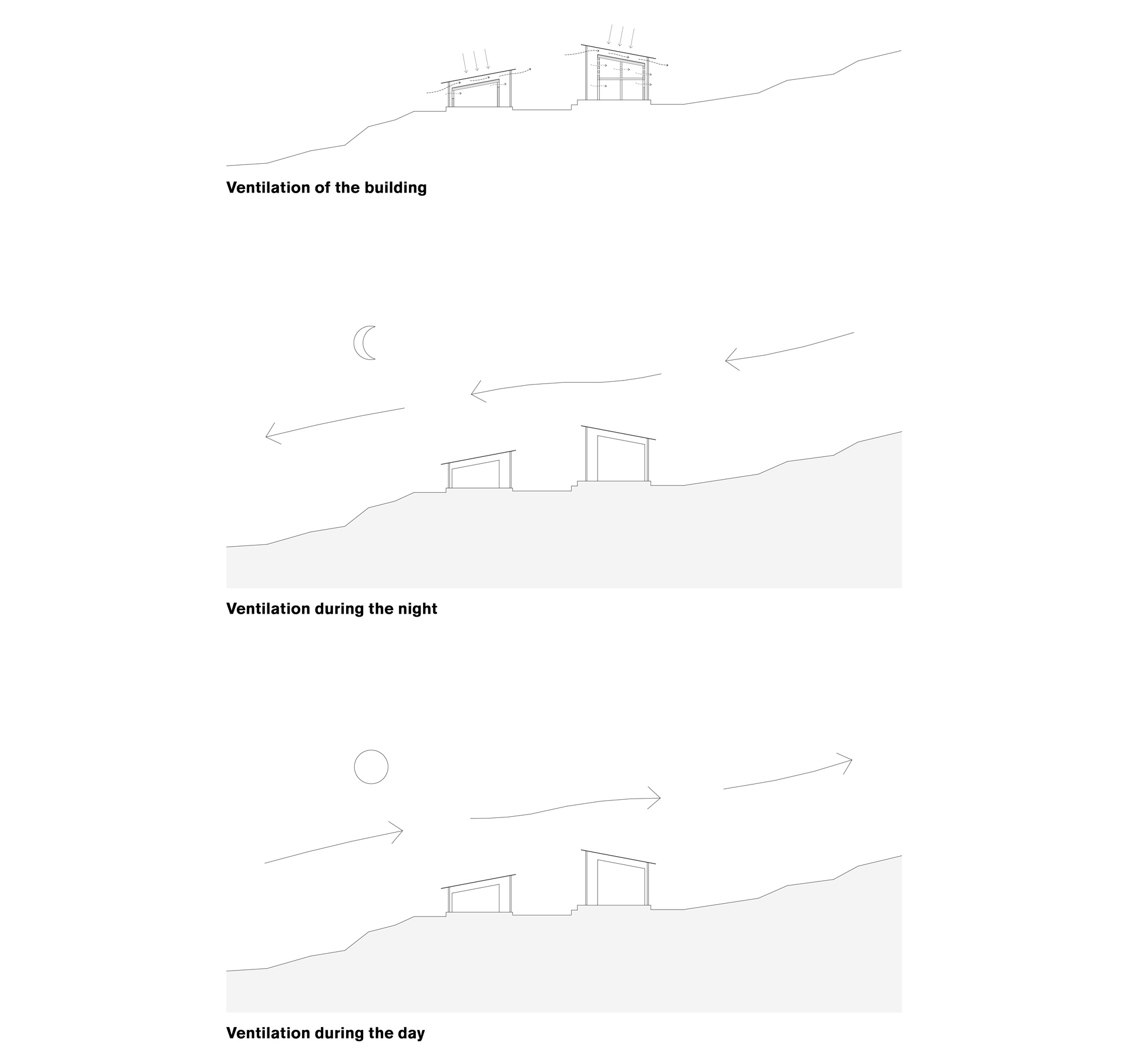 Die intensive Sonneneinstrahlung ist ein weiterer Parameter, dem man mit durchdachtem Design auf einfache Weise begegnen kann. Um die Räume vor Überhitzung zu schützen, wurden große auskragende Dächer gebaut. Diese werfen nicht nur Schatten, denn sie sind zweischalig ausgelegt und haben einem Luftspalt in der Mitte. Dort hindurch kann die Luft strömen und die absorbierte Sonnenenergie abführen. Das reduziert effektiv den Energieeintrag für die darunter gelegenen Räume. Ein Sonnenschutz an den Fassaden ist ebenfalls vorgesehen.