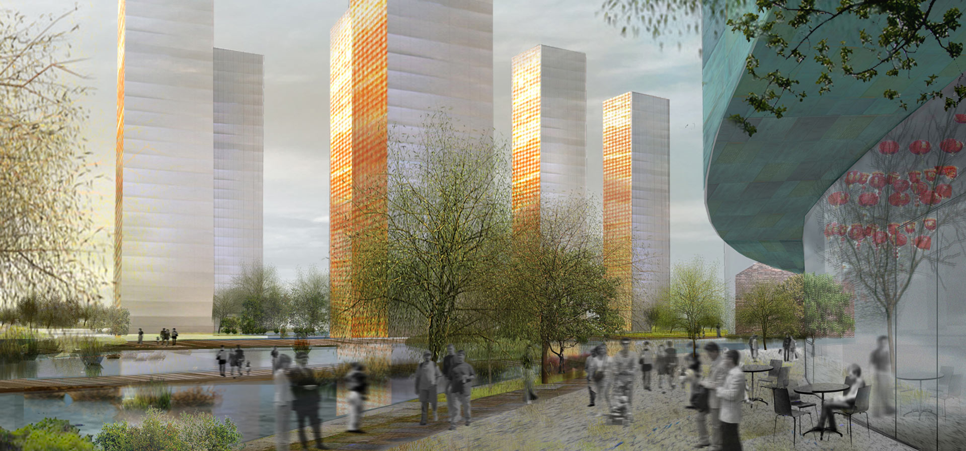3.) Die LANTERN TOWERs sind von den alten Steinlaternen in West Lake inspiriert, die "Feuer über Wasser" setzen. PV-Glasvorhänge gewinnen tagsüber Sonnenenergie, in der Nacht „glüht“ jeder Turm durch spezielles Fresnel-Glas und spiegelt die Energie des Tages im Wasser. Ein Loft-Apartment pro Etage ist durch einen Aufzug mit den Gemeinschafts-Lobbys unter dem Teich verbunden. Health Club, Spa, Retail Shopping und Parkplätze finden sich in den unteren Ebenen.