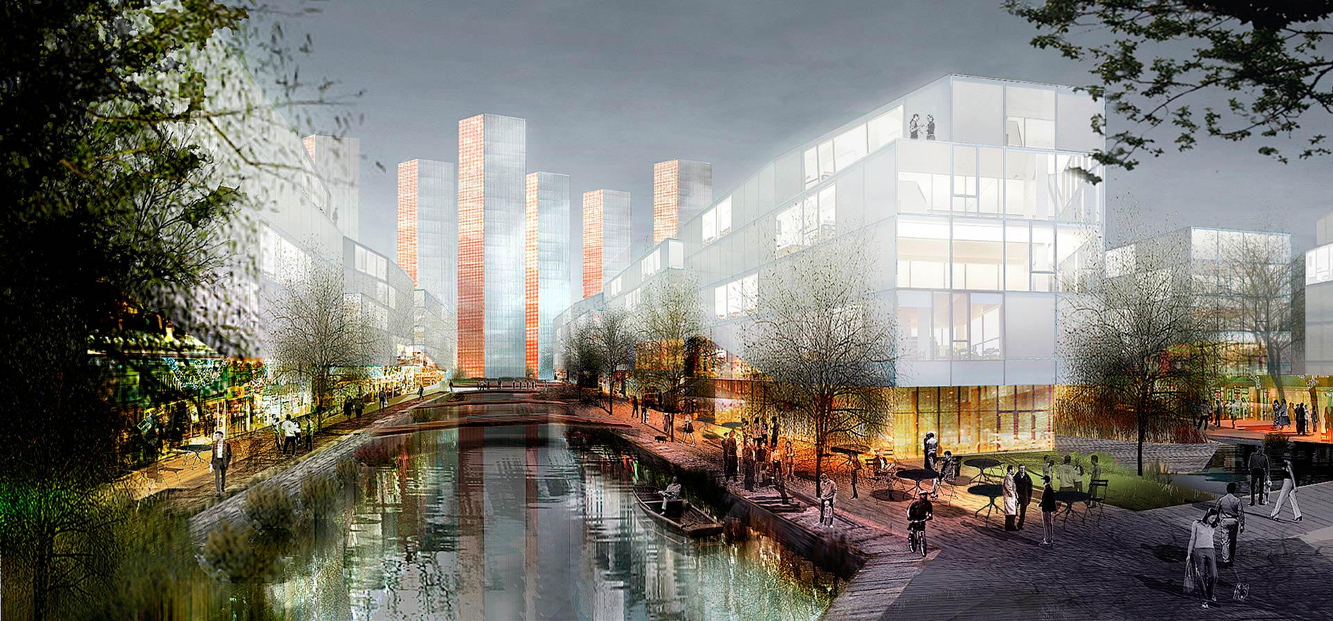 2.) Die Hybridgebäude der CANAL SPREADER schaffen Raum zum Leben am Wasser entlang eines bestehenden Kanals und fünf neuer. Sie bieten unterschiedliche Wohnformen sowie Büros, Cafés, Restaurants und Geschäfte entlang öffentlicher Wege.
