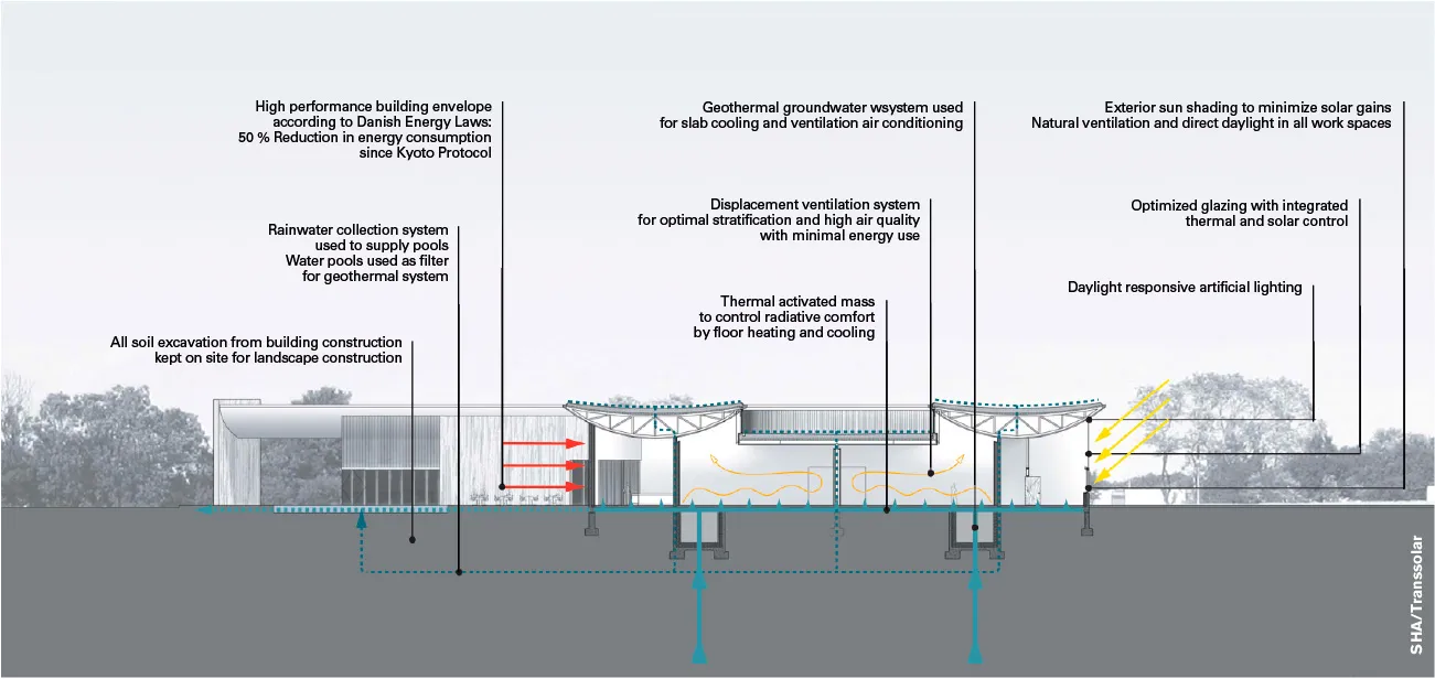 Die 50 Meter tiefen Geothermiebohrungen dienen der freien Kühlung und als Wärmeableitung für die Kältemaschinen. Dies System ist in Dänemark das erste seiner Art und erwies sich als sehr energie- und kosteneffizient. Steven Holl deckte einen Teil der zusätzlichen Kosten mit einem Anteil seines Honorars und unterstreicht damit sein Engagement für einen solch ganzheitlichen Designansatz.