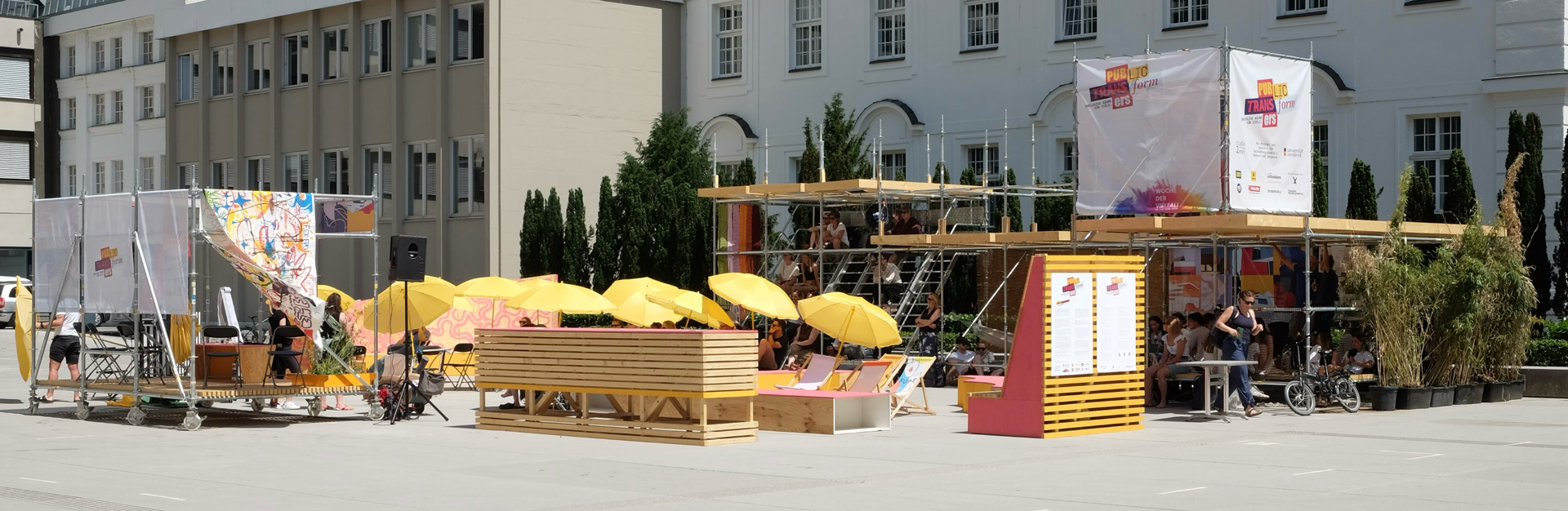 Das Ergebnis der Zusammenarbeit mit dem Studio 2 der Architekturfakultät, dass die Gesamtkonstellation der Stadtmöbel und Gerüste entwickelte und baute, machte den Platz nicht nur klimatisch angenehmer, sondern an heißen Tagen eigentlich erst nutzbar. Ermöglicht haben das die Verschattungs-Installationen aus Holz, Bast und Stoff ergänzt mit etwas Begrünung sowie zwei DryMist-Fans.