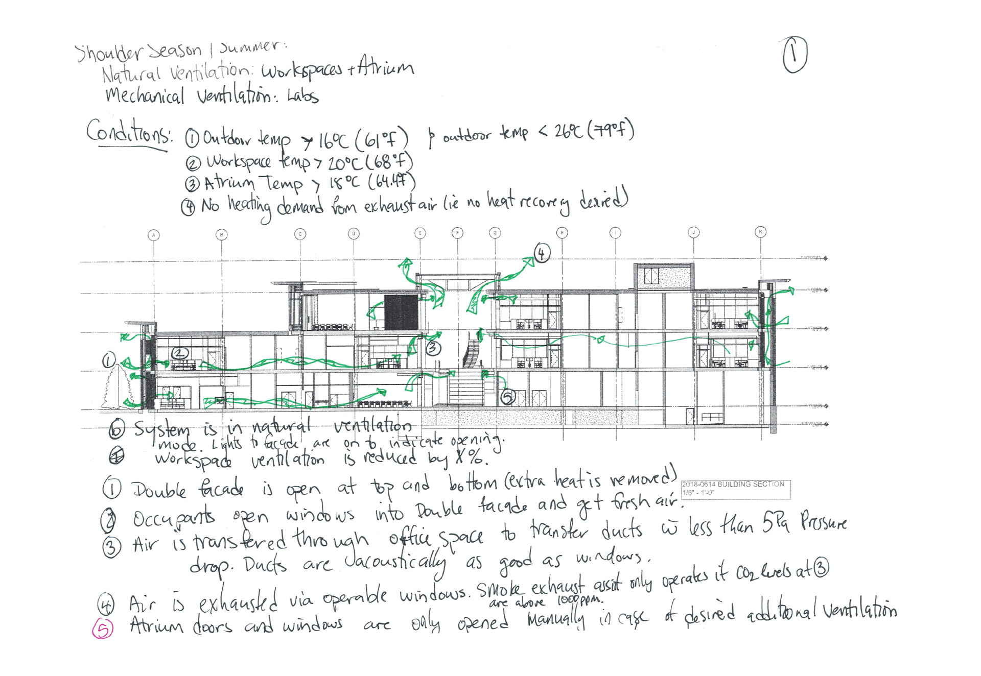 Ziel des Entwurfs war, das ganze Gebäude mit Tageslicht zu durchdringen; detaillierte Tageslichtstudien unterstützten die Ausgestaltung. Bewegliche Sonnenschutzbehänge in der Doppelfassade ermöglichen einen effizienten sommerlichen Wärmeschutz. Das Atrium wird über transparente vertikale Flächen natürlich belichtet. Auch die innere Erschließung, die als hölzerne Verbindungsstege an der Dachkonstruktion hängend ausgebildet sind, gibt indirekt Tageslicht an die Labore ab.