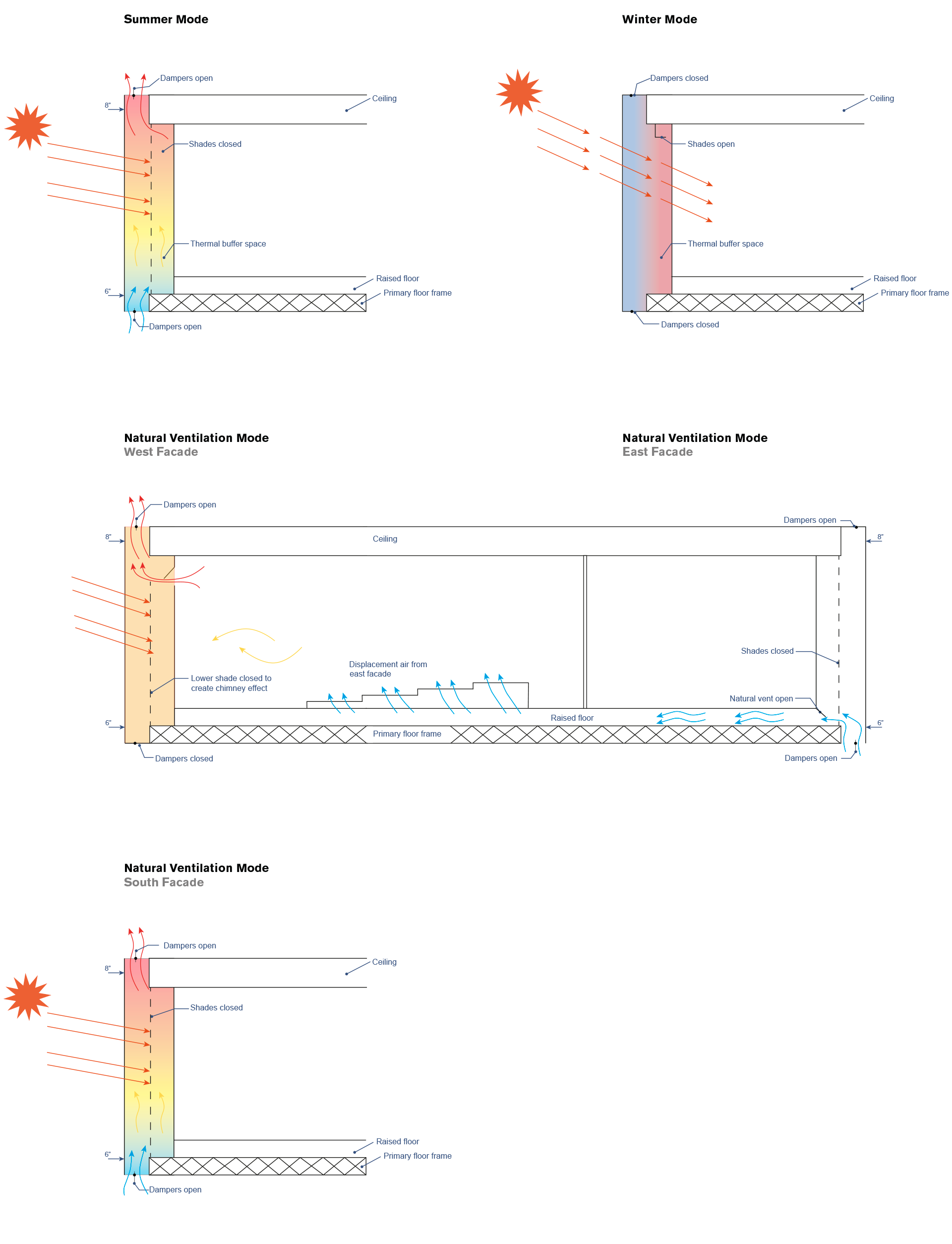 In der äußeren Glaswand sind oben und unten motorisierte Klappen. Im Winter sind beide Öffnungen geschlossen, um den Wärmeeintrag der Sonne als Isolierung zu nutzen. In warmen bis heißen Monaten sind beide Klappen geöffnet, dabei entlüftet der sogenannte Kamineffekt den Zwischenraum auf natürliche Weise. Die warme Luft entweicht durch die oberen Klappen und zieht aus der verschatteten Unterseite kühlere Luft durch die unteren Klappen in den Zwischenraum.