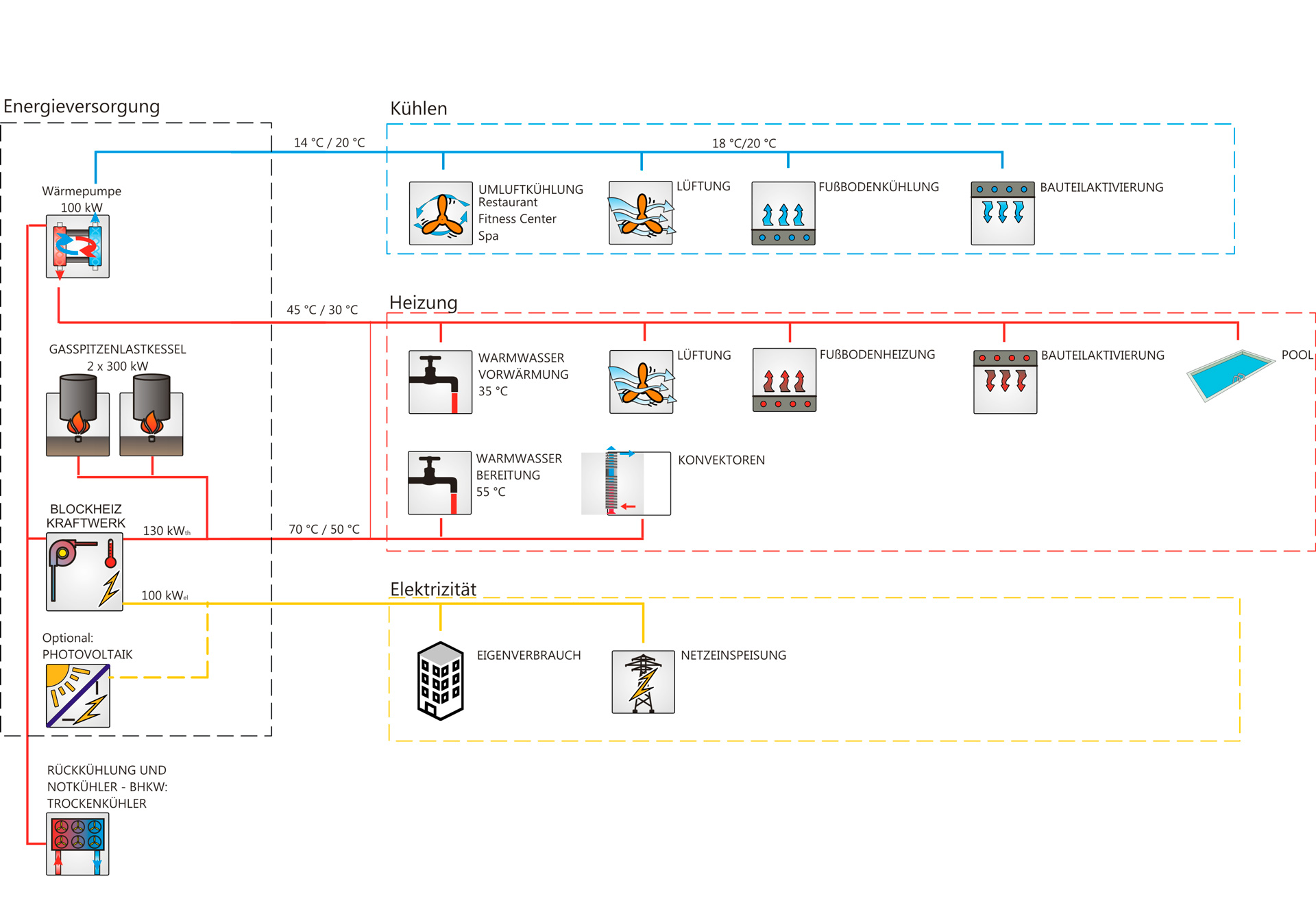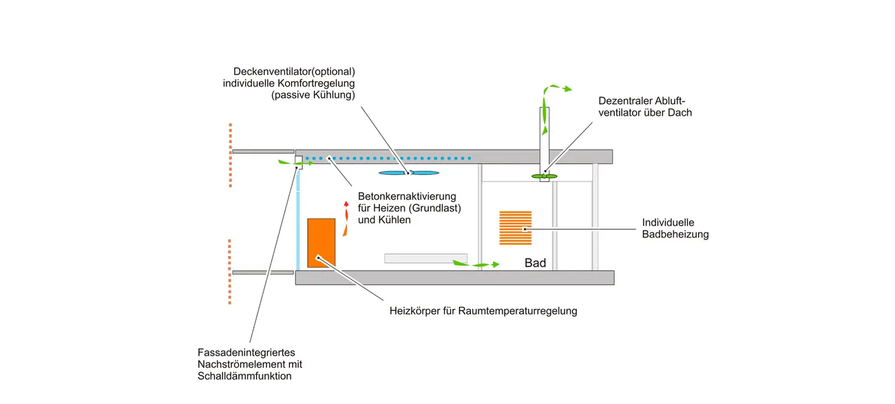 Das neue Hotel am Bostalsee, einem Erholungsgebiet im Saarland, ist seit Juni 2017 unter dem Namen „Seezeitlodge Hotel & Spa“ eröffnet. Die herrliche Aussicht vom kleinen Kap auf den See allein reicht für einen erfolgreichen Hotelbetrieb nicht aus. Das Vier-Sterne-Hotel hat 100 Zimmer und Suiten, einen 2.000 m² großen Spabereich, Gastronomie und mehrere Tagungsflächen. Transsolar hatte in der Planung die beratende Aufgabe, dafür zu sorgen, dass die Gäste zufrieden sein können mit Aufenthaltsqualität und Behaglichkeit im Gebäude hinsichtlich Wärme, Licht und Luft. Gleichzeitig müssen geringe Energie- und Wartungskosten gesichert sein. Der Neubau sollte zeigen, dass ein hoher Komfort ohne erhöhten Energiebedarf möglich ist und gleichzeitig ökologisch tragfähig. Transsolar nutzte thermische, Strömungs- und Tageslichtsimulation, um das Energie- und Komfortkonzept iterativ zu entwickeln, also wiederholend mit schrittweisen Änderungen, gemeinsam mit dem Architekten und dem Bauherrn. Eine Herausforderung bestand darin, die standortprägende freie Sicht auf den See zu erhalten, während der sommerliche Wärmeeintrag in das Gebäude unter Kontrolle bleiben muss. So wurden die Balkone der Hotelzimmer und die vorgehängte Holz-Lamellen-Struktur in Bezug auf Sonnenschutz, Tageslichtnutzung als auch Sichtbeziehung optimiert. Vor dem Erdgeschoss sind motorisierte Großsegel installiert, die bei Bedarf Schatten spenden: Der Terrasse, den Fassaden, der Lobby, dem Restaurant und den Veranstaltungsräumen - bei dennoch freier Sicht und freiem Durchgang. In den Hotelzimmern besteht die Grundbeheizung und -kühlung in Form von Betonkern-Aktivierung: Die Zimmerdecken selbst dienen als Heiz- bzw. Kühlkörper. Im Winter können die Räume individuell über dezentrale Konvektoren temperiert werden. Ist es warm genug, können die Fassaden großflächig geöffnet werden. Alle Zonen des Gebäudes werden bedarfsgerecht je nach Außentemperatur mechanisch oder natürlich gelüftet. Die Hotelzimmer werden in Abhängigkeit der Belegung über dezentrale Abluftventilatoren mit Nachströmung über die Fassade gelüftet. Den Grundbedarf an Energie deckt ein gasbetriebenes Blockheizkraftwerk; die Abwärme der Kältemaschine wärmt das Brauch-Warmwasser vor und beheizt Wasser im Wellnessbereich.