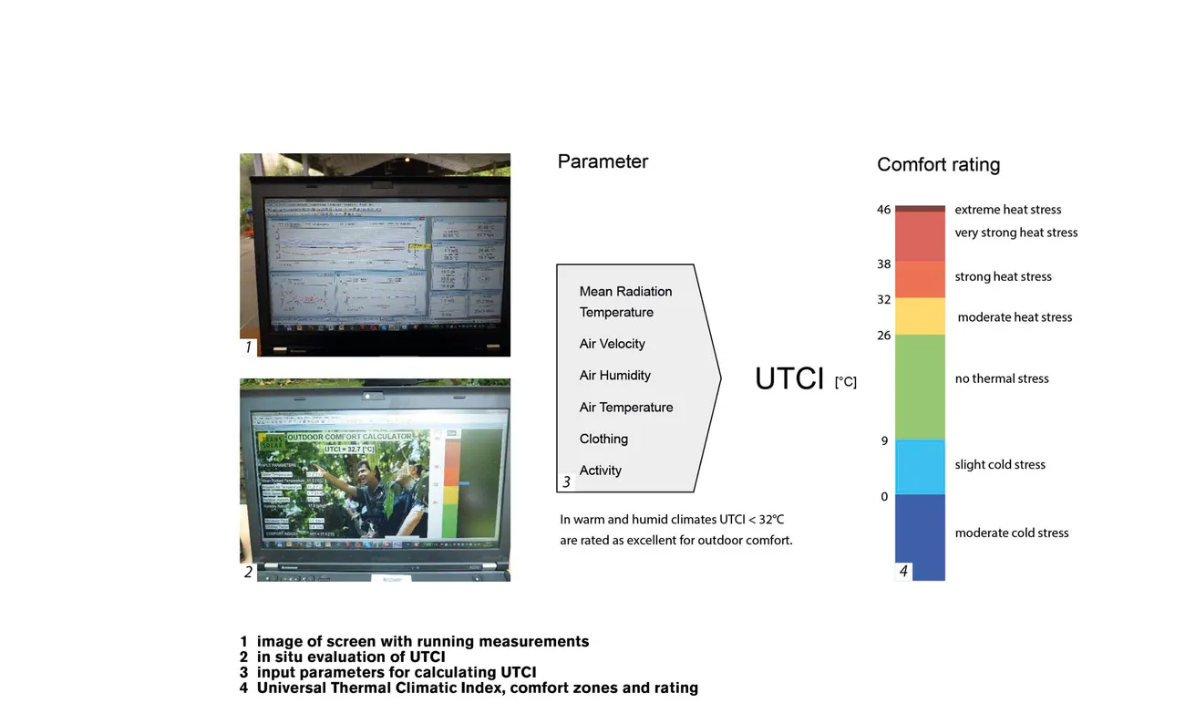 Transsolar hat sich daher mit fortschrittlichen Modellen aus der Human-Biometeorologie befasst, also der Wissenschaft, die Wechselwirkungen zwischen atmosphärischen Prozessen und Lebewesen, hier den Menschen, erforscht. Technisch formuliert lautet das Ergebnis: Trotz Erhöhung der Luftfeuchte bietet eine vollständig entwickelte adiabatische Kühlung in Kombination mit erhöhten Luftgeschwindigkeiten die Möglichkeit für eine große Verbesserung des Komforts im Freien.