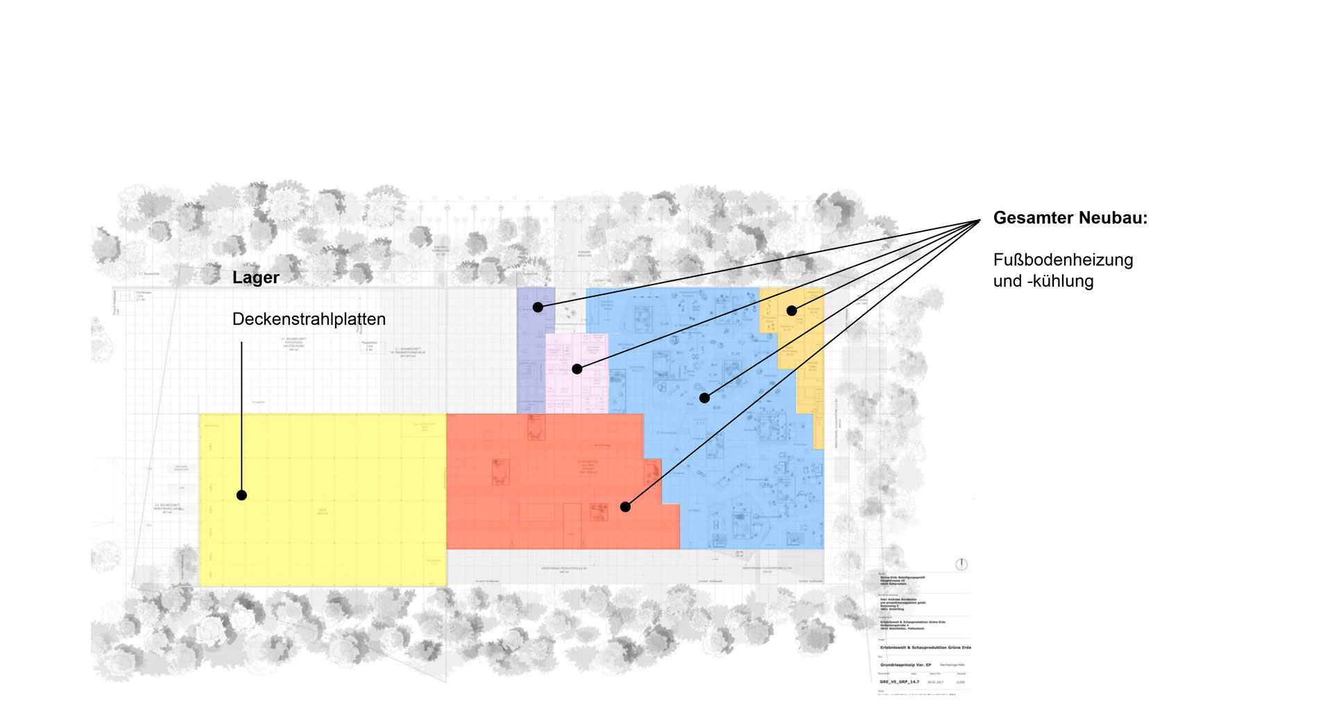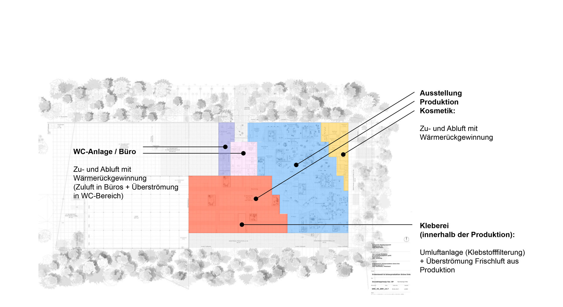 Transsolar hat das Energie- und Klimakonzept hinsichtlich thermischer Behaglichkeit, Frischluftqualität, solarer Gewinne, Verschattung und Tageslicht integral entwickelt und die Funktion mit Hilfe von dynamischer Simulationen für Gebäude und Tageslicht optimiert. Ein gänzlich innovativer Bestandteil des Gebäudes sind die 13 bepflanzten Lichthöfe – ein architektonisches und klimatechnisches Novum für ein Betriebsgebäude. Die zwischen 20 - 30 m² großen und Baumbepflanzten Lichthöfe tragen nicht nur wesentlich zur natürlichen Belichtung bei, sondern dienen auch der natürlichen Durchlüftung des Gebäudes.
