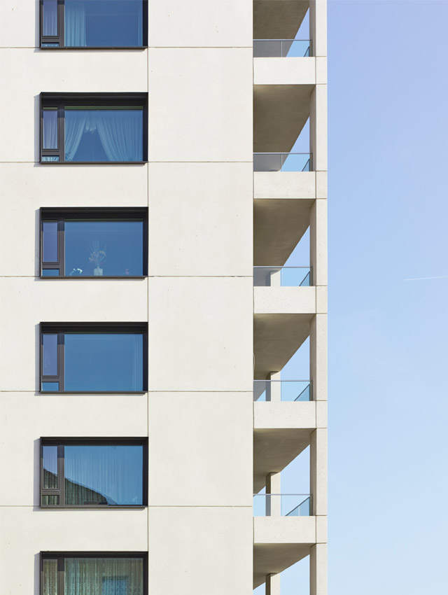 Zentrale Bausteine des Entwurfskonzeptes sind eine neue hochgedämmte, hinterlüftete Gebäudehülle aus Betonsteinen im Passivhaus-Standard und die Schaffung großzügiger, überdachter privater Balkone. Die neue Gebäudehülle trägt zu einer deutlichen Steigerung des Wohnkomforts der Bewohner bei (Schall-, Sonnen- und Wärmeschutz). Die Elektronachtspeicherheizungen und Warmwasserboiler in den jeweiligen Wohnungen wurden durch eine komplett neue haustechnische Anlage ersetzt. Die Heizwärme und die Brauchwassererwärmung werden über einen in die Fassade integrierten Kapillar-Solarabsorber erzeugt. Wärmepumpen machen die gewonnene Energie nutzbar. Der Eisspeicher mit einem Volumen von 58 m³ dient je nach Saison als Wärme- oder Kältezwischenspeicher. Photovoltaikmodule und eine Kleinwindkraftanlage auf dem Dach decken den Strombedarf. Frischluft kommt über die dezentrale Lüftung, die mit Wärmerückgewinnung arbeitet.