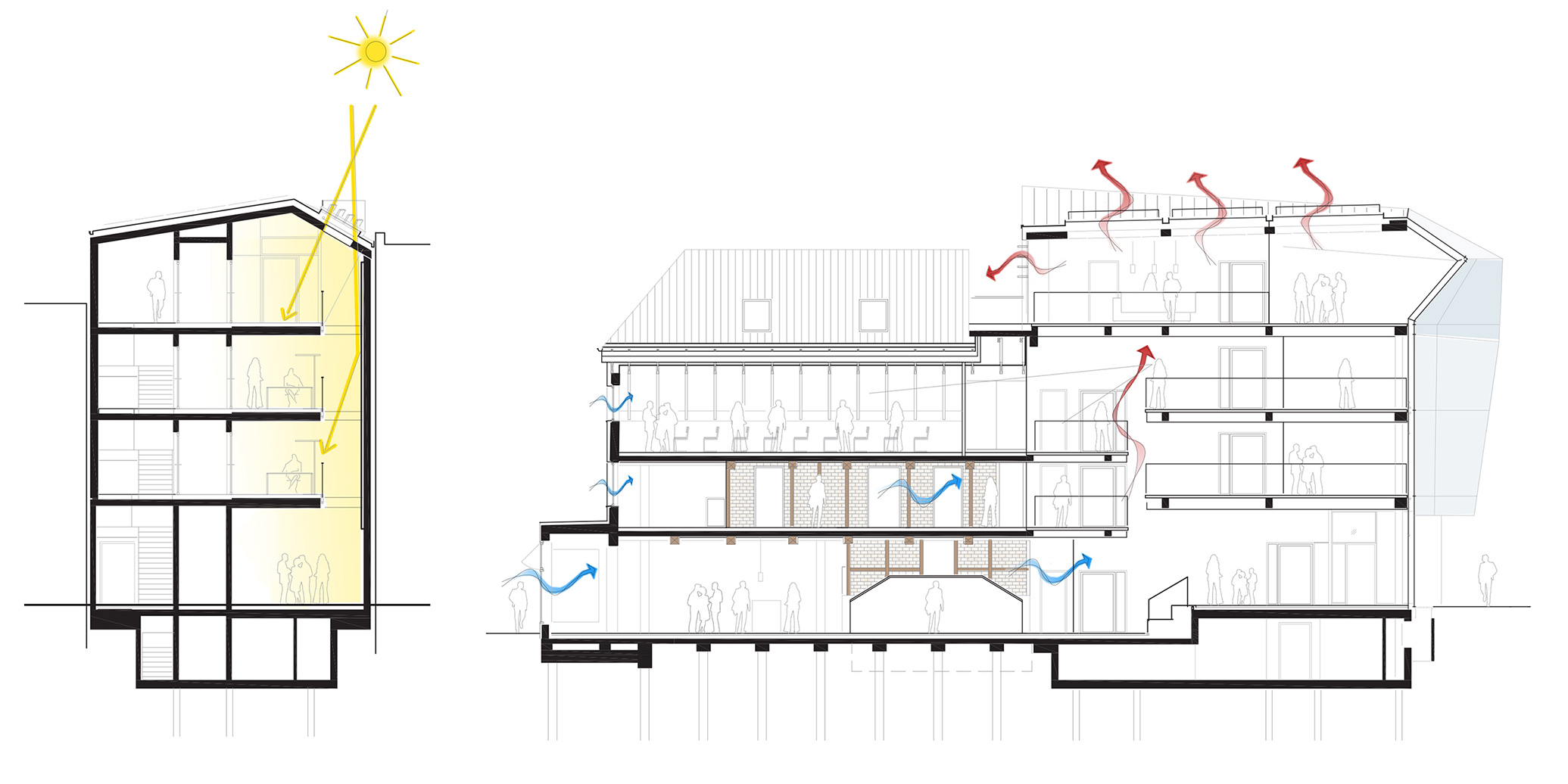 Die städtebauliche Situation erfordert ein ausgeklügeltes Tageslichtkonzept, denn die zur Verfügung stehende Fläche sollte bestmöglich genutzt werden, das Grundstück grenzt jedoch auf beiden Seiten an Gebäude. Ein vertikaler Korridor zwischen der neuen Südfassade und dem alten Gebäude erlaubt Lichteinfall; ausreichend Tageslicht dringt so auch in die Tiefe des Gebäudekomplexes. Gleichzeitig dient er als Solarkamin für die Abluft. Er ermöglicht eine natürliche Querlüftung auf allen Etagen des neuen und alten Gebäudes. Die nach Süden ausgerichtete Fassade ist mit fest integrierten Mikrolamellen in der Verglasung ausgestattet und bietet ausreichend Verschattung. Die nach Südwesten abgewinkelte Richtung der Fassade benötigt bewegliche Verschattungselemente. Wärmeverluste und solare Gewinne wurden durch thermische Modellierung ausbalanciert.