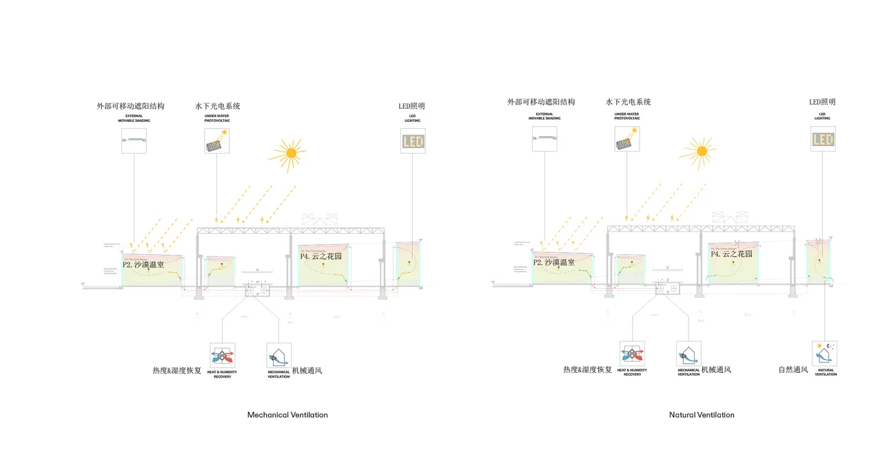 Für die Erstellung eines Wüsten- und eines tropischen Klimas war ursprünglich eine Konditionierung mit Klimatechnik für die Gewächshäuser vorgesehen. Zur Reduzierung des enormen Energieaufwands war eine zweifache Wärmeschutzverglasung angedacht. Eine solche Verglasung hat den großen Nachteil, dass viel Einstrahlung verloren geht, was unter Umständen mit Kunstlicht ausgeglichen werden müsste, damit die Pflanzen gedeihen, denn vorgesehen sind Gewächse, die aus klimatischen Zonen stammen, die sehr viel Licht bieten: Die Gewächshäuser dieses Projekts sollen eine Wüste beherbergen, einen tropischen Regenwald und den Wolkengarten.