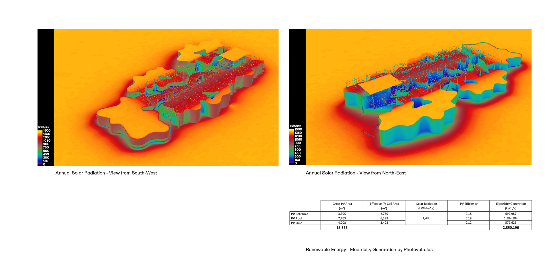 Photovoltaik ist zur Erfüllung des Nullenergieziels notwendig, aber auf dem Dach des Gewächshauses nicht unterzubringen. Dafür wird die ehemalige Struktur einer Industriebrache genutzt, die auf dem Grundstück verbleiben soll, und mit PV belegt. Aber selbst bei vollständiger Bedeckung reicht die Fläche nicht aus, um die angestrebte ausgeglichene Energiebilanz zu erzielen.