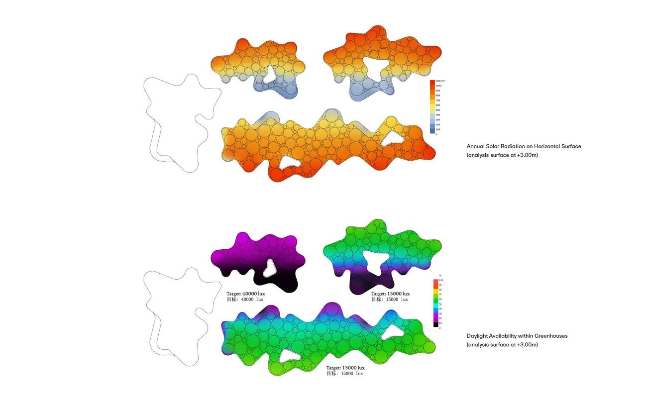 Mit unseren Simulationen konnten wir zeigen, dass bei der relativ hohen Jahresdurchschnittstemperatur Shanghais eine Isolierverglasung mit ihren niedrigen Wärmeverlusten deutlich weniger einsparen würde, als die dann notwendige künstliche Belichtung der Pflanzen verursacht durch die hohen Kosten für Energie. So ließ sich der Bauherr überzeugen, auf Wärmeschutzverglasung zu verzichten, was die leichte und elegante Fassadengestaltung ermöglichte. Die Pflanzen erhalten dadurch die maximale Sonneneinstrahlung. Zusätzlich werden die Gewächshäuser ausschließlich auf natürliche Weise gelüftet und damit rein passiv gekühlt, was den Energiebedarf erheblich reduziert. Dem Risiko einer sommerlichen Überhitzung beugt ein außen angebrachter, beweglicher Sonnenschutz der Dachverglasung vor.