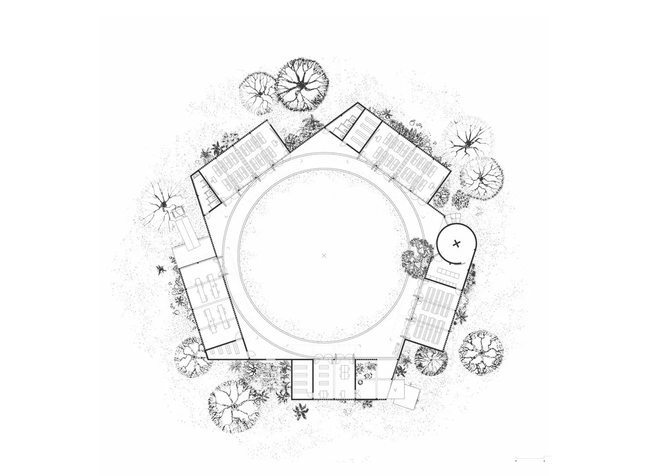Es galt die wenigen höheren Bäume als wertvolle Schattenspender zu auf dem Grundstück zu bewahren. So sind die Bäume nun von fünf Pavilions umgeben und schaffen mit einer perforierten Mauer den zentralen Innenhof. Zum Schutz vor Überflutung und Sandverwehungen sitzen die Gebäude auf einem Sockel. Die Anlage besteht aus zwei großen multifunktionalen Klassenzimmern, einer Küche mit Cafeteria, Werkstätten, Lager, einem Wasserturm und der Verwaltung sowie WCs. Sport- und Kinderspielplatz liegen im Außenbereich. Die weit auskragenden Dächer spenden Schatten und schützen vor Regen, sperren Wind jedoch nicht aus.