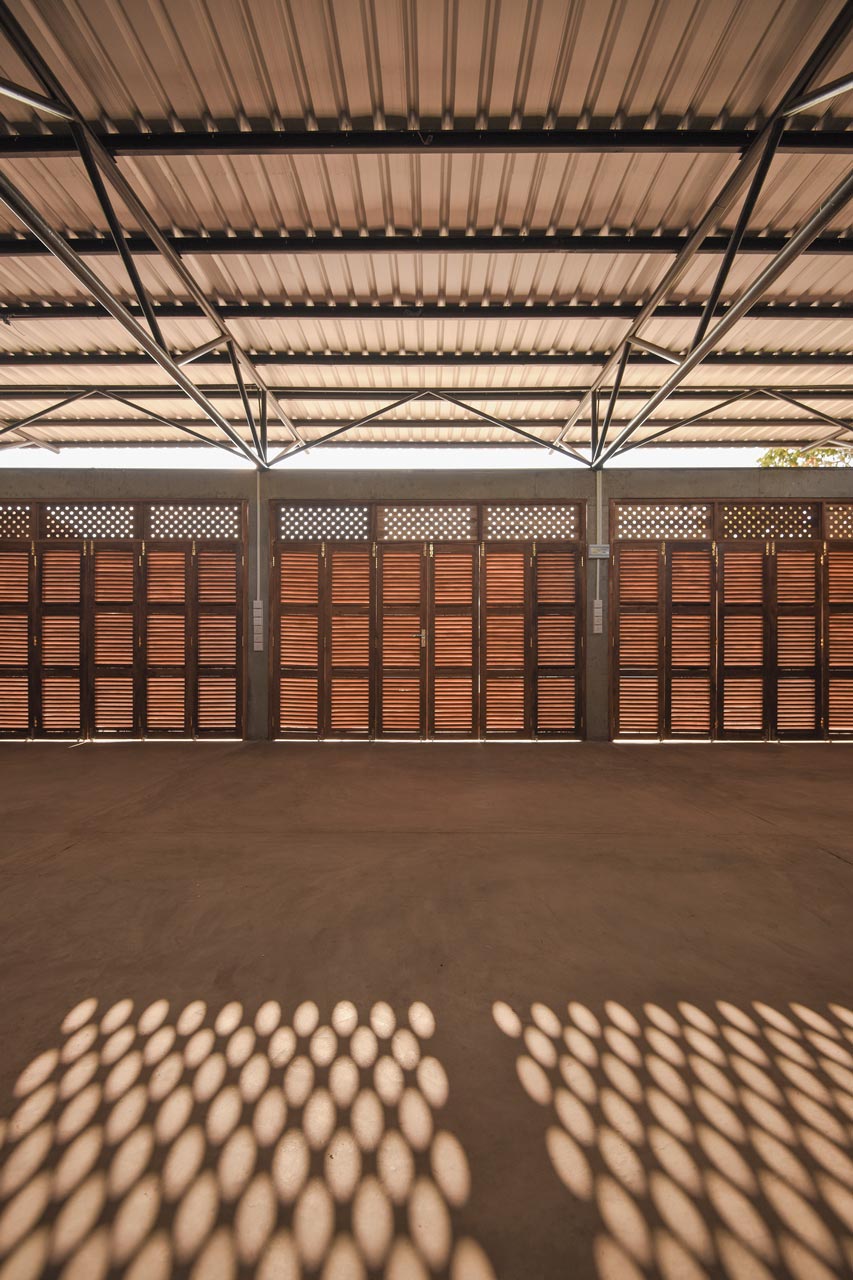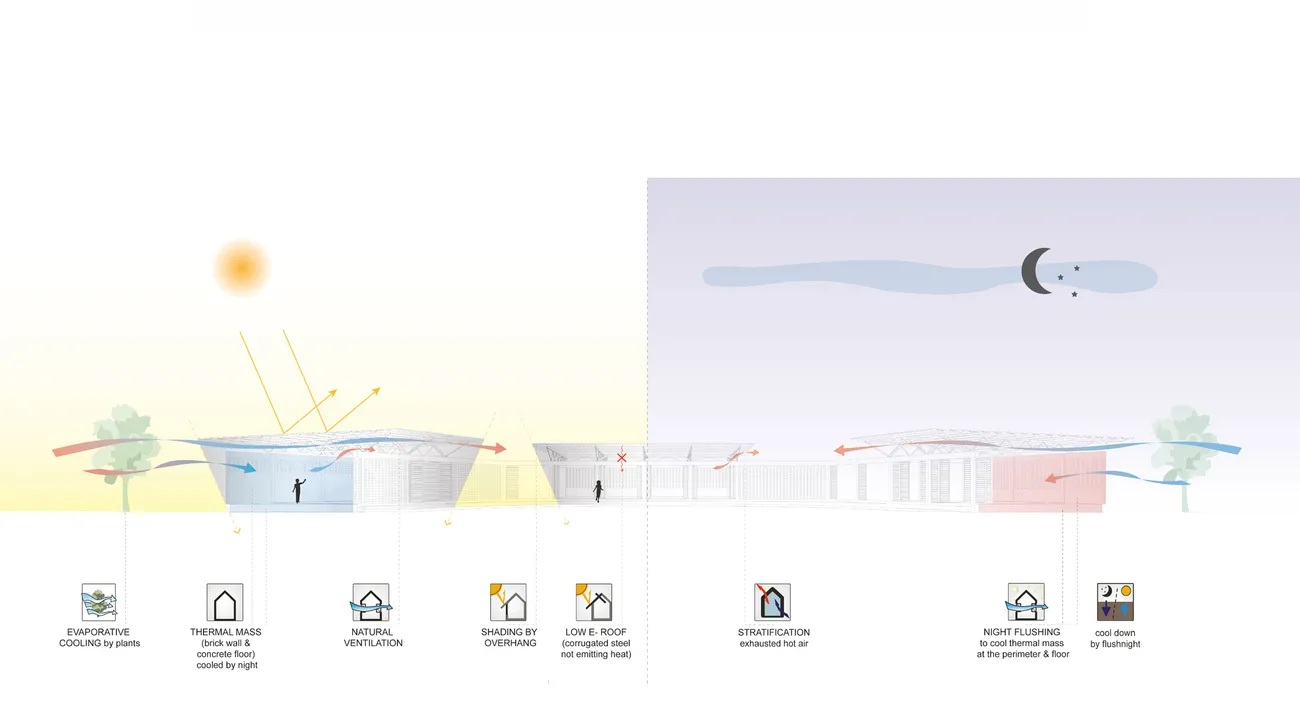 Die Pavilions nutzen gezielt die bestehenden Bäume als Schattenspender. Auch die weit auskragenden Dächer verschatten Innenraum und Wände. Die Räume vermeiden Hitzestau durch den Abstand zwischen Baukörpern und Dächern. Deren Aluminiumsheets reflektieren zudem einen Teil der Sonnenenergie und minimieren das Abstrahlen der Wärme durch Ihre low-e Oberflächeneigenschaft. Das spendenfinanzierte Budget erlaubt keine verglasten Fenster, daher sind die perforierten Mauern eine gute Lösung, denn sie ermöglichen so erst die Nutzung des Gebäudes in den heißen Sommermonaten: Der meist wehende leichte Wind zieht unterhalb der Dächer und durch die perforierten Mauern und führt die Wärme ab. Schiebefaltwände aus Holz ermöglichen das Konzept der flexiblen Mehrfachnutzung der Räume .