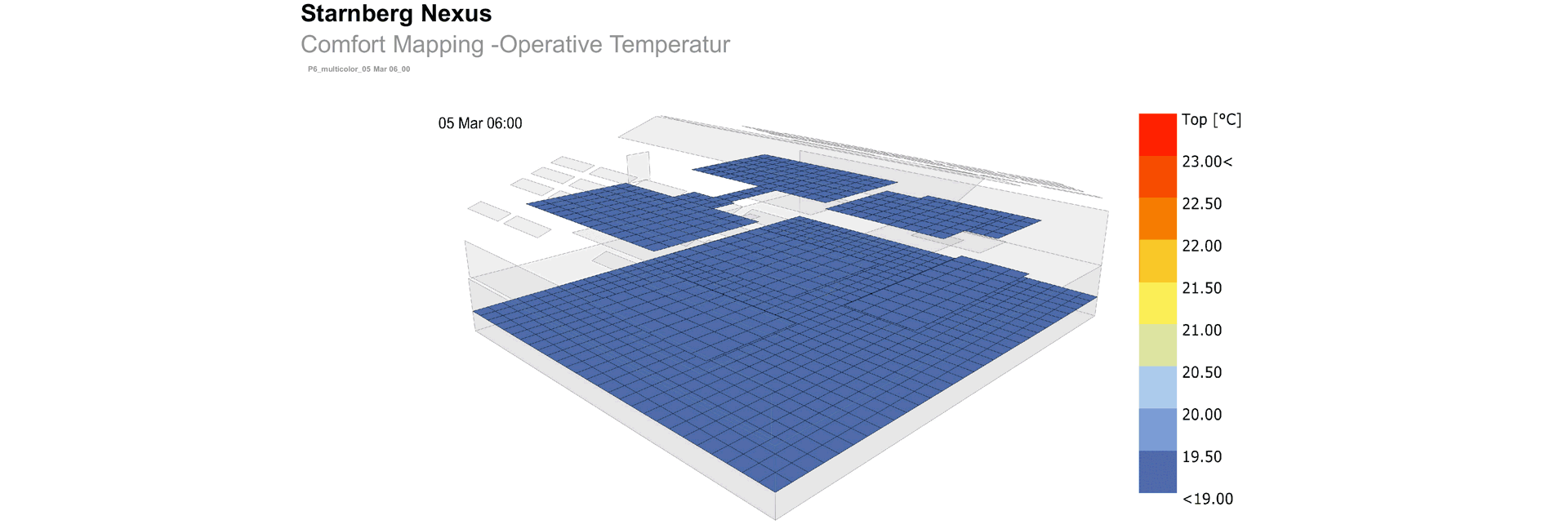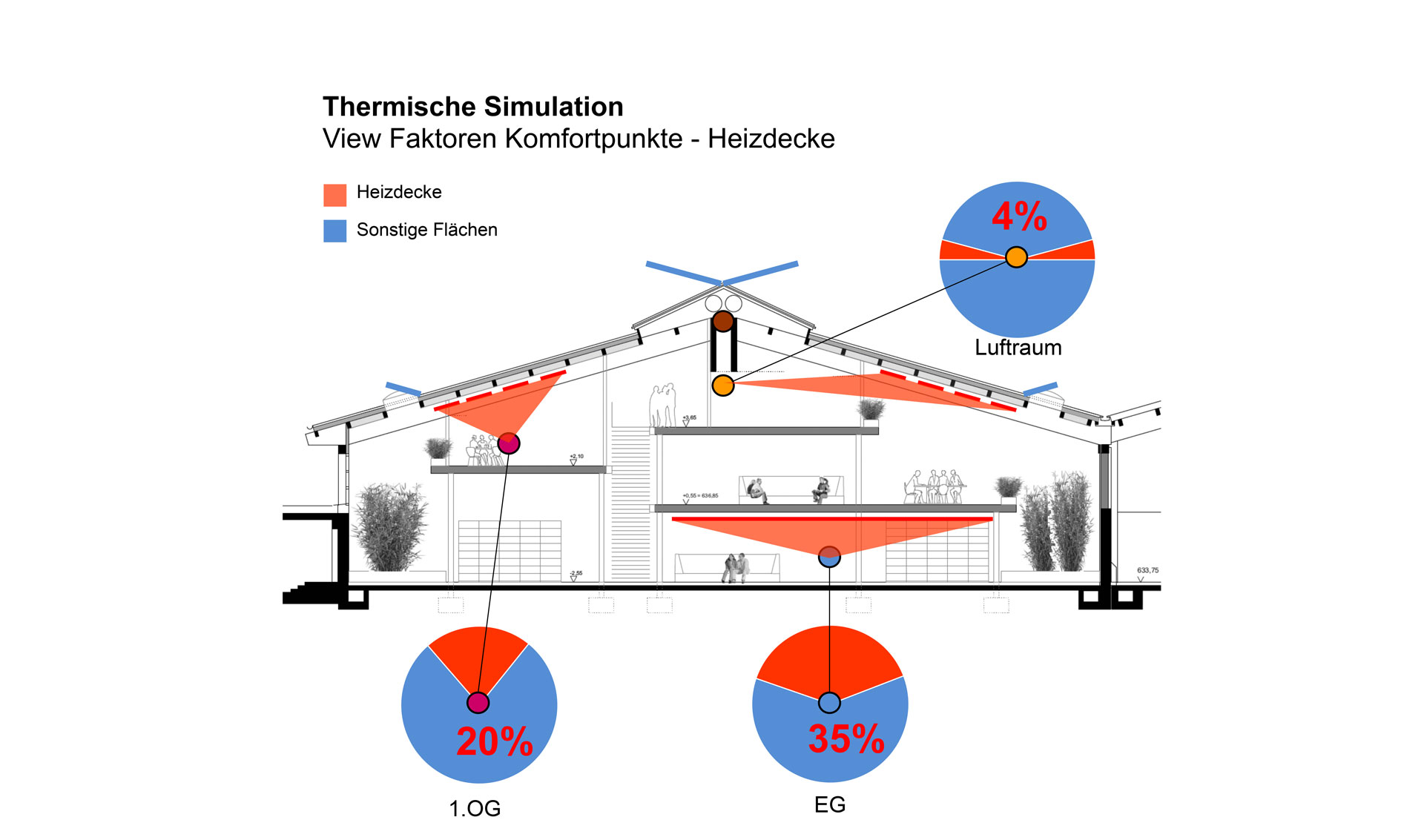 Um die Flächenheizsysteme in Bezug auf Flächenanteil, Vorlauftemperaturen und Position auszulegen, hat Transsolar detaillierte Simulationen und „Viewfaktor“-Analysen verwendet. Von einem geringen „Viewfaktor“ spricht man, wenn der Anteil an warmer Fläche relativ gering ist, also ein großer Anteil kühler Fläche die Menschen anstrahlt. Den „Viewfaktor“ zu beachten, gilt es, um vorzubeugen, dass die gefühlte Temperatur an bestimmten Stellen als zu niedrig empfunden wird, weil geringe mittlere Strahlungstemperatur und z.B. niedrige Lufttemperatur zusammenwirken.