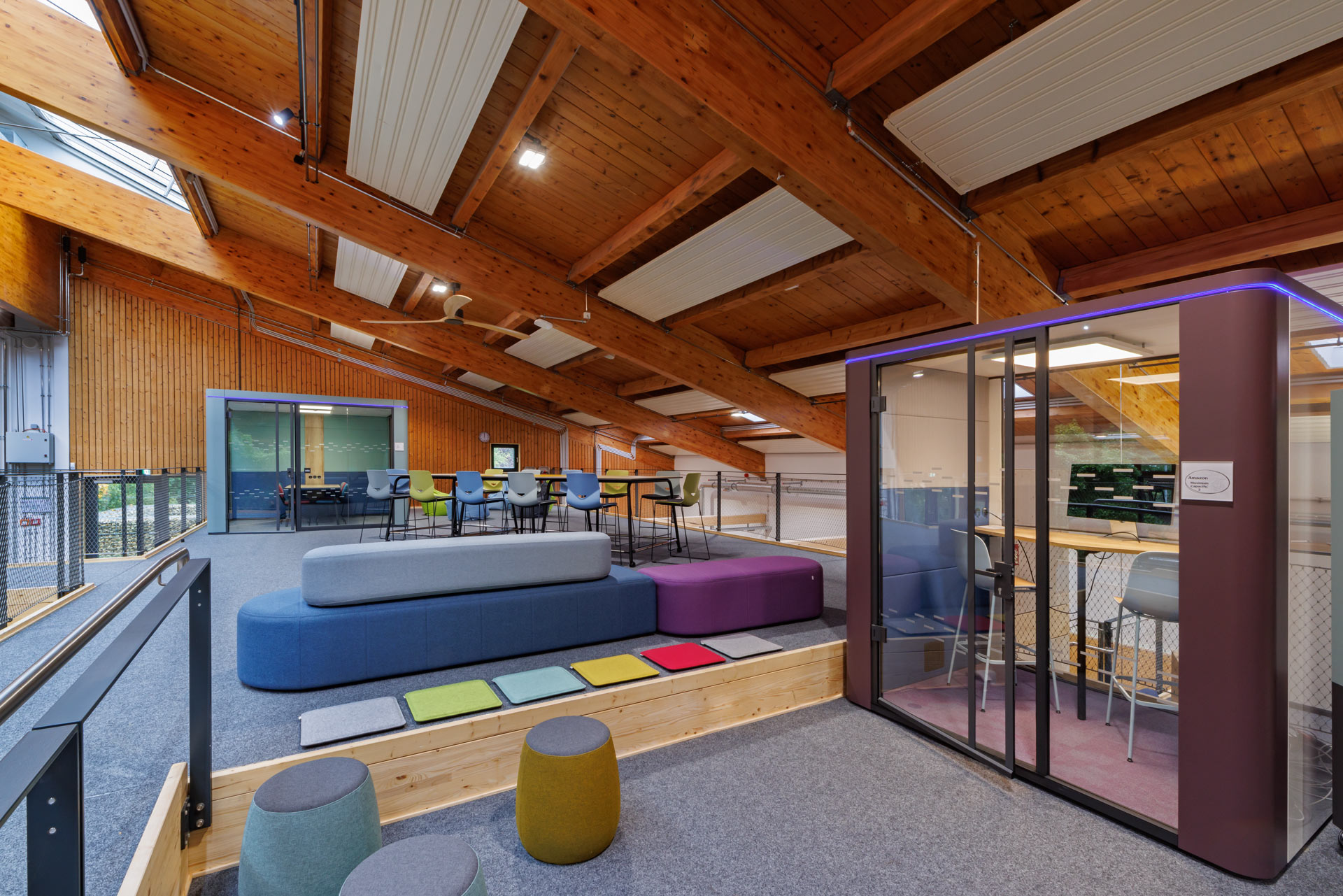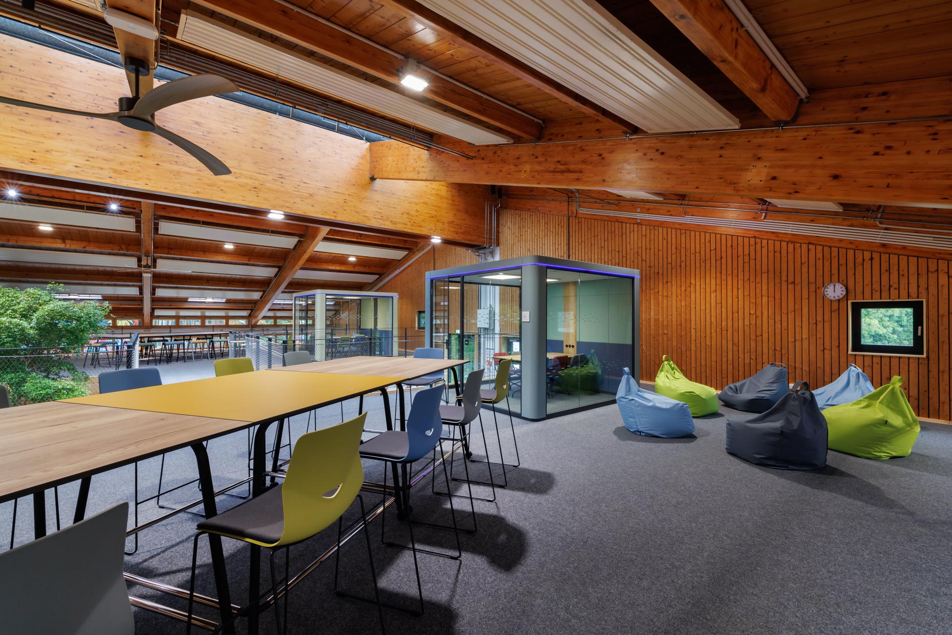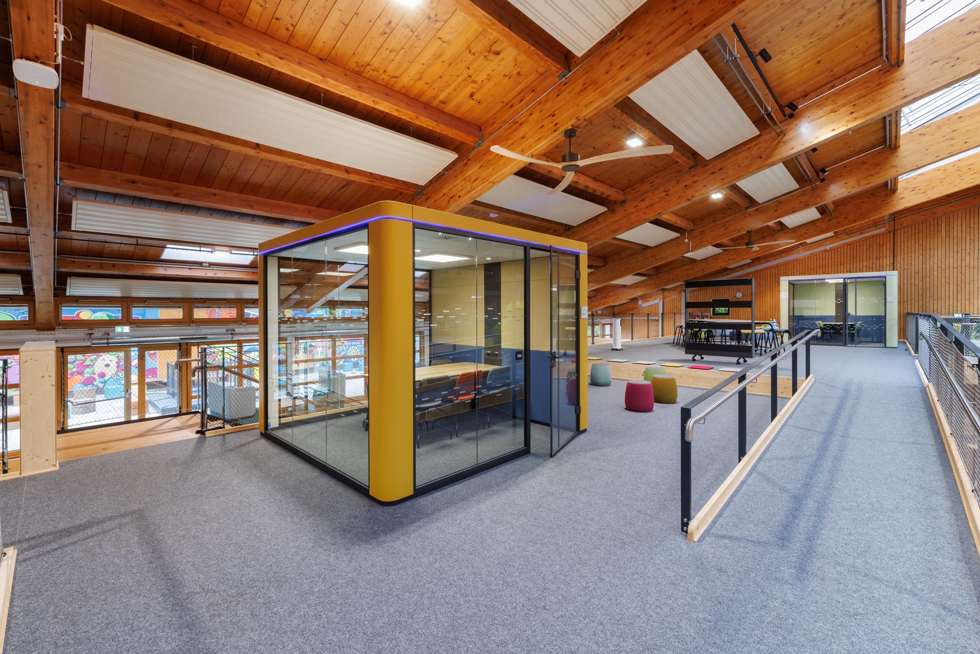 Für Besprechungen gibt es die Teamwork-Boxen. Diese sind schallgedämmt und sie bedienen sich mit einem eigenen Lüfter ausgestattet, am Luftvolumen des Hubs. So ist den Lernenden die Möglichkeit gegeben, so unabhängig wie möglich zu arbeiten, das erforderliche Maß an Aufsicht durch Erwachsene bleibt gewährleistet.