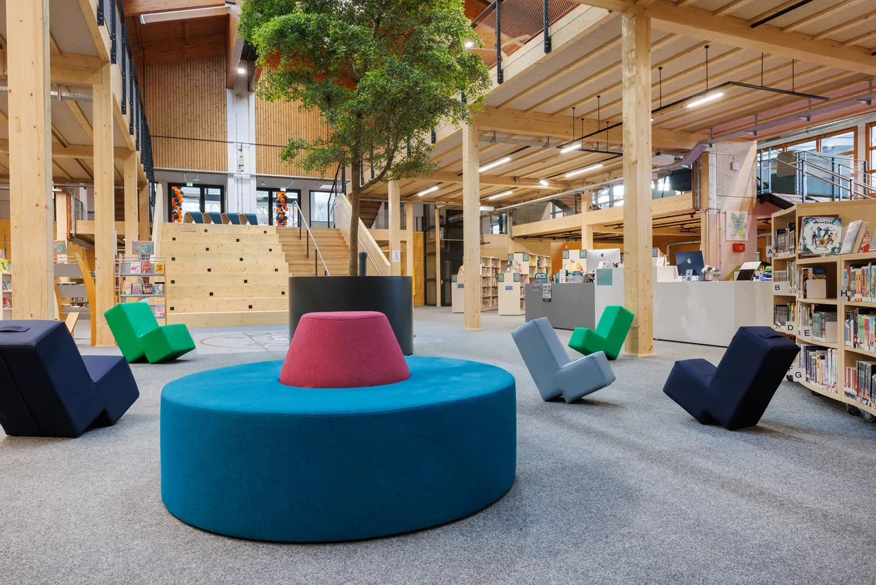Die Munich International School hatte sich das Ziel gesetzt durch „einfache Füllung“ eine bestehende Sporthalle in ein multifunktionales Zentrum, den „Learning NeXus“, einen futuristischen Co-Working-Space, zu verwandeln. Der Learning NeXus soll allen Ressourcen bieten, die die Schüler benötigen, um zusammenzuarbeiten, innovativ zu sein und groß zu denken. Darin befindet sich im oberen, also dem Erdgeschoss, ein Labor-Klassenzimmer und vier Bereiche für die Zusammenarbeit sowie der IT-Hub und die Lernunterstützung. In der unteren Etage ist die Bibliothek untergebracht sowie drei Deep Learning-Bereiche.