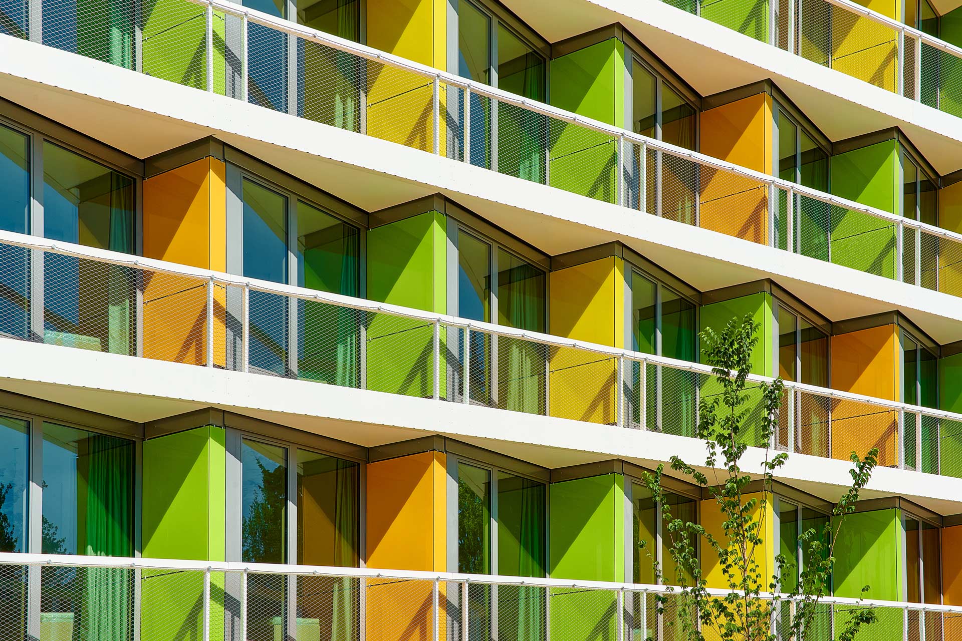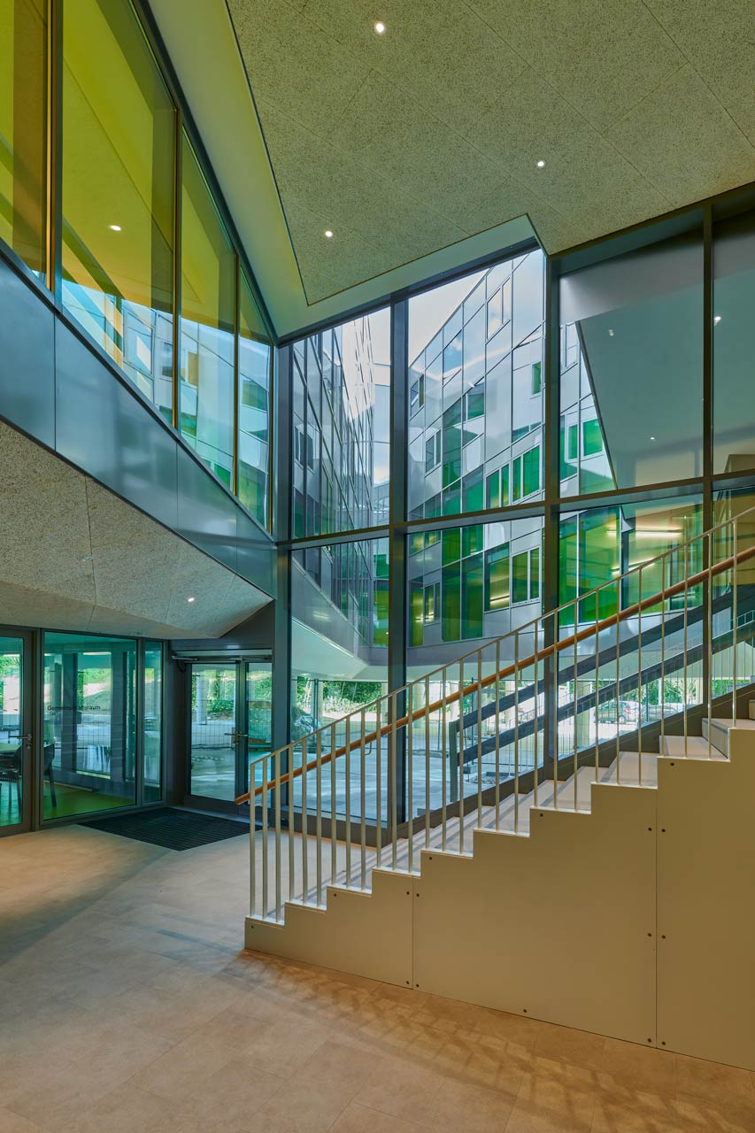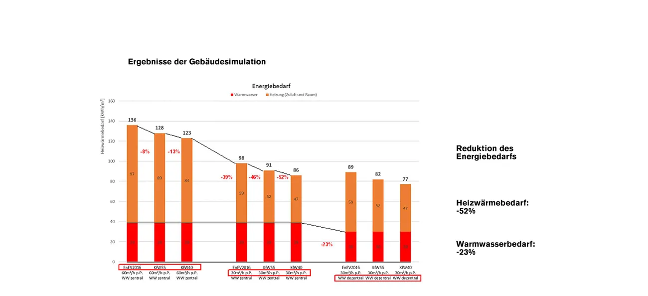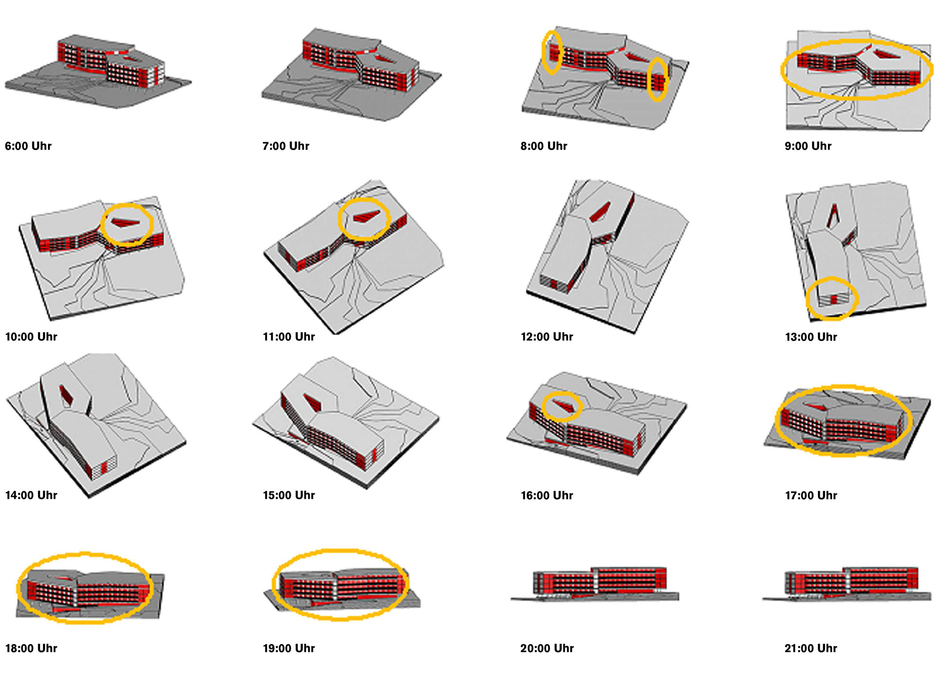 Für Transsolar stand die Energieeffizienz des Gebäudes im Vordergrund sowie Robustheit im Gebäudebetrieb durch gezielt technikarmes Bauen sowie einfache Bedienbarkeit durch die Nutzer. Statt elektrisch/motorisch betriebenen Systemen wurde manuellen/selbsttätigen Systemen der Vorzug gegeben. Eine effiziente Ausführung der Gebäudehülle reduziert den Energiebedarf um 8% gegenüber den gesetzlichen Vorgaben (KFW 55). Eine Betriebsoptimierung der Lüftung senkt deren Energiebedarf um 46% durch feuchtegeführten Betrieb der Abluftanlage. Das Verwenden dezentraler Frischwasserstationen senkt den Energiebedarf für Warmwasserbereitung um 23%. Um auch in heißen Sommerperioden angemessene Innenraumtemperaturen gewährleisten zu können, hat Transsolar passive Maßnahmen zur Verschattung des Gebäudes ermittelt und optimiert: Bei den Glasflächen spenden die auskragenden Balkone und opaken Außenwandflächen, die nach Süden verdreht angeordnet sind, Schatten. In Verbindung mit der hohen thermischen Masse der Tragwerkskonstruktion sind helle innenliegende Vorhänge als zusätzliche Möglichkeit zur Verschattung für hohen sommerlichen Komfort ausreichend.