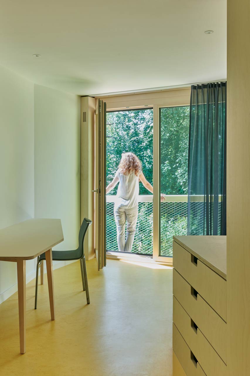 Das Studentenwohnheim hat einen langgestreckten, aber geknickten und gestaffelten Baukörper. Es besteht aus 119 Einzelappartements, 10 Dubletten-Einheiten und 16 Wohngruppen. Die Wohnmodule liegen sich gegenüber, sind über einen gemeinsamen Flur erschlossen und sind entweder nach Westen oder nach Osten orientiert. Zwei Treppenanlagen dienen dem Zugang und über einen durchgehenden Aufzug ist die Barrierefreiheit über alle Ebenen gegeben. Nach der Gesamtbetrachtung der Lebenszyklusanalyse, den Anforderungen der Tragwerksplanung und der Anforderung an Robustheit der Konstruktion fiel die Entscheidung für die Ausführung in Massivbauweise, hoch wärmegedämmter Gebäudehülle mit einem optimierten Lüftungssystem mit fassadenintegrierter Zulufterwärmung und zentralem Abluftsystem.