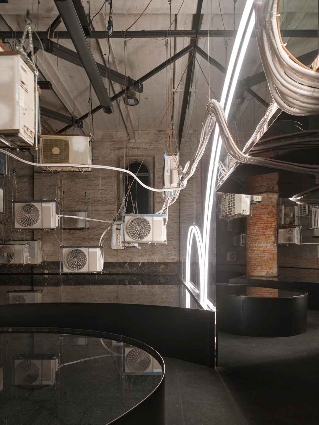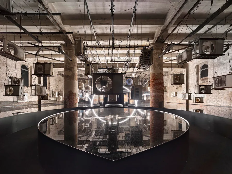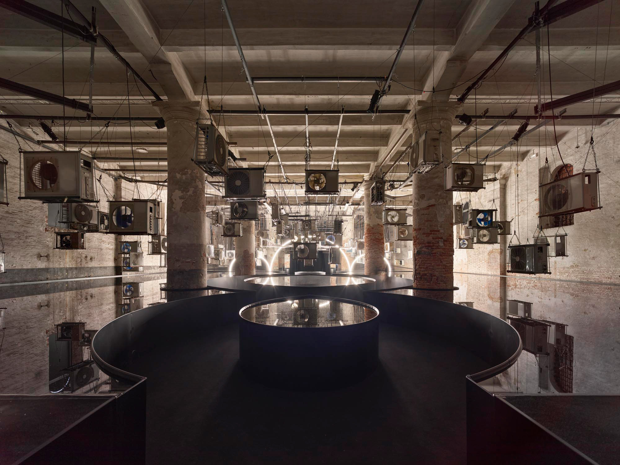 Die Installation fokussiert diese Themen mit realen wie allegorischen Mitteln. 80 der 92 Klimageräte stammen von italienischen Schrottplätzen, 12 sind voll funktionsfähig und pumpen Abwärme in den Eingangsraum, während sie die große Ausstellungshalle kühlen. Mit dem Weg durch den Raum bewegt man sich zugleich durch die Zeit: Am Eingang herrschen noch die Bedingungen der Welt draußen, an einem Sommertag in Venedig 2025 aber mit Durchqueren des Raumes steigt die Dichte der Klimageräte und die Hitze nimmt zu. Ein horizontaler Temperaturgradient bleibt aber naturgemäß nicht stabil, die Schwerkraft wirkt auf die Luft und sorgt für Bewegung. Daher wird dieser horizontal zunehmende Wärmeverlauf gezielt radiativ unterstützt. Der Ansatz mit Strahlungswärme macht es möglich, die entlang des Weges zunehmend steigende Temperatur für die Besucher spürbar aufrecht zu erhalten. Nahe dem Ausgang ist es so heiß und feucht, wie es den Verhältnissen entspricht, die für das Jahr 2100 vorhergesagt werden.