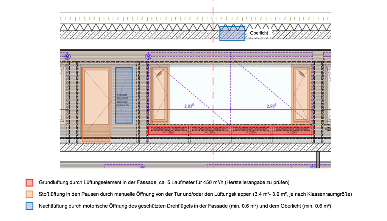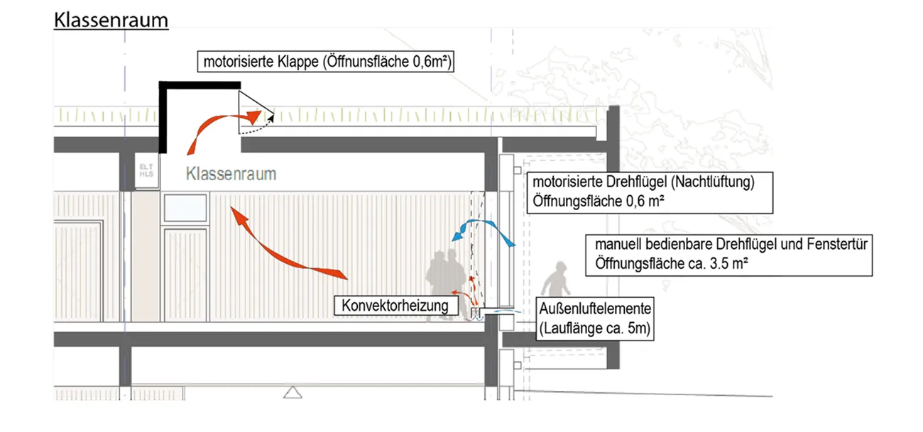 Die Klassenräume werden natürlich be- und entlüftet. Eine natürliche Querlüftung entsteht über Oberlichter in der Decke, während die Zuluft, je nach Außenbedingungen durch Außenluftdurchlässe in der Fassade (Winter) oder durch unterschiedliche öffenbare Fenster in den Raum zugeführt wird. Im Sommer ist eine automatisierte Nachtluftauskühlung möglich.