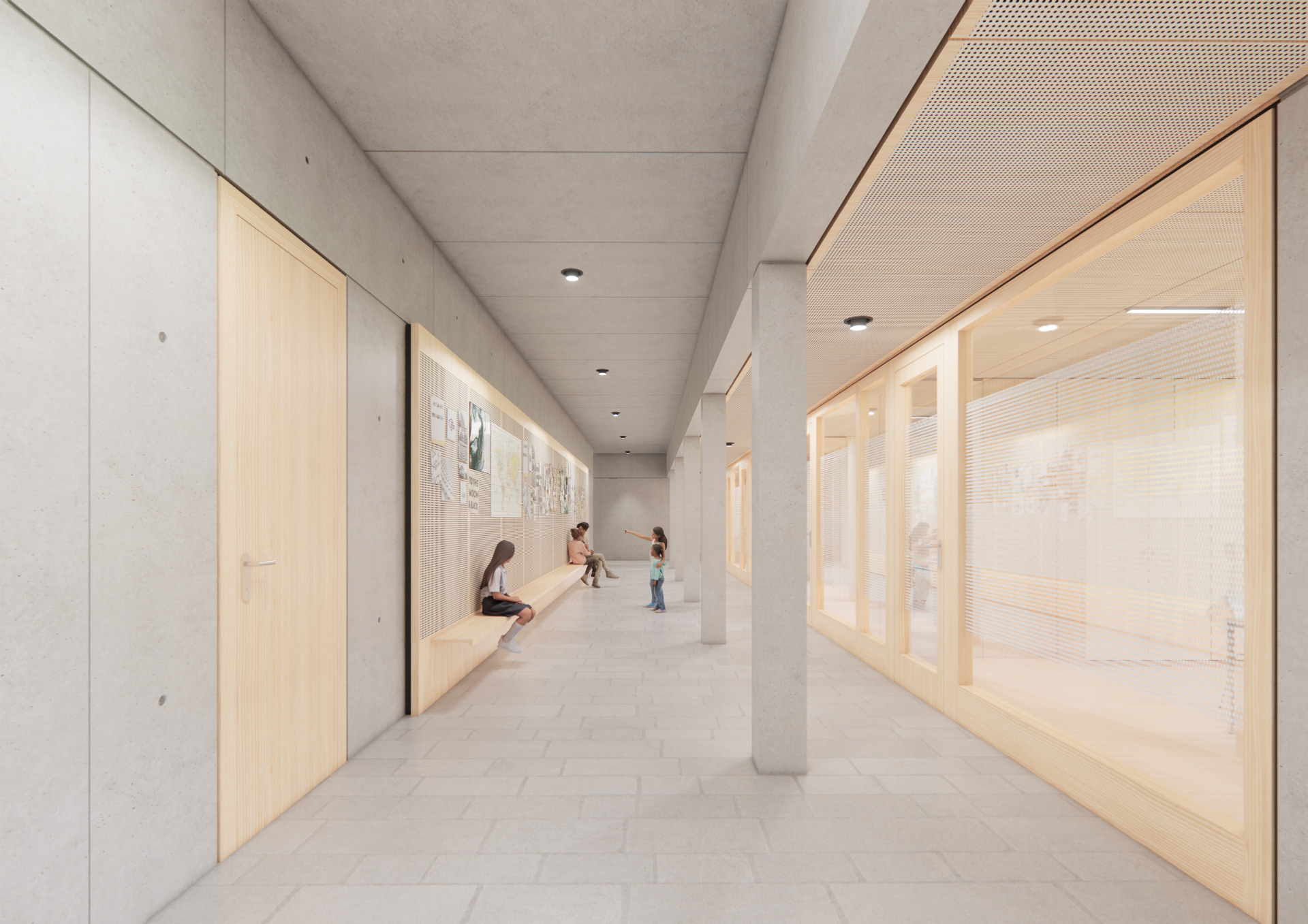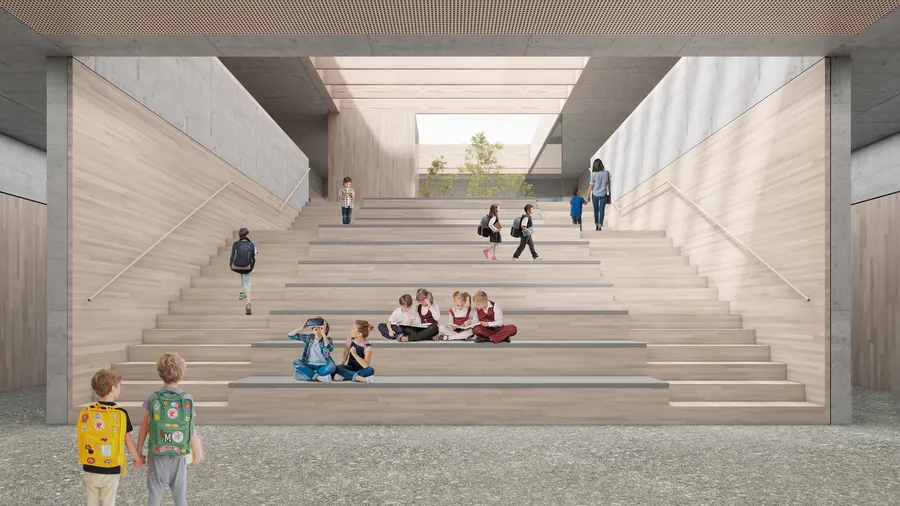 Eine einfache Grundrissstruktur im Inneren ermöglicht eine gute Orientierung. Die Eingangshalle dient als Verteilerzone. Sie ist mit dem Speisesaal zusammenschaltbar. Die große Eingangstreppe dient als zentrales, kommunikatives Forum, Sitzelemente ermöglichen Aufführungen. Klassen und Fachräume sind in den Obergeschossen angeordnet, die Räume für die Nachmittagsbetreuung im EG mit Anschluss an die Außenanlagen. Eingeschnittene Höfe sorgen für eine gute Belichtung und Belüftung der Kernzonen. Die Bibliothek bildet die zentrale Lernmitte. Auch die Flure bieten Flächen für offene Kommunikations- und Lernmöglichkeiten.