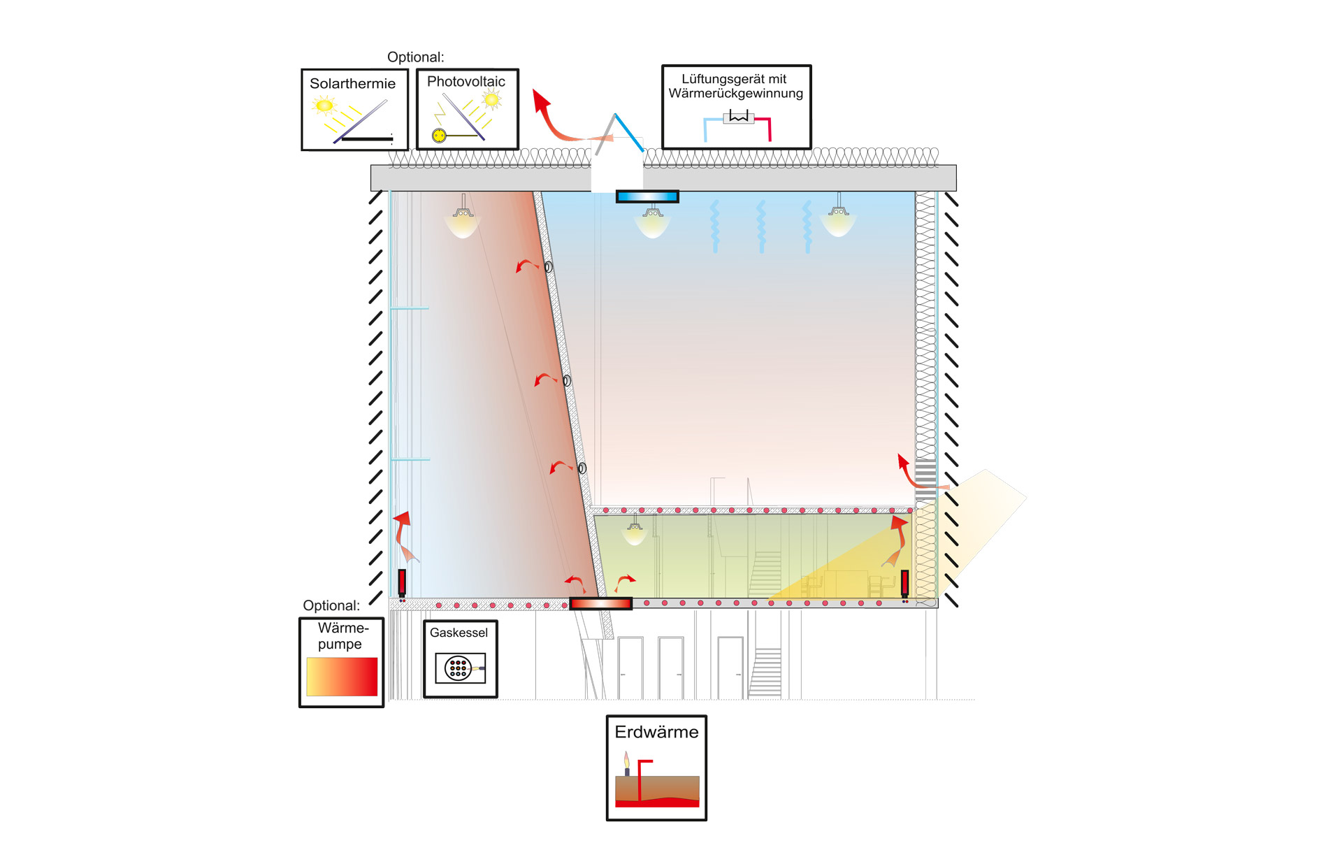 In den Wintermonaten wird das Gebäude durch hocheffiziente Lüftungsgeräte mit Frischluft versorgt. Sofern die äußeren Bedingungen es zulassen, wird die mechanische Lüftung abgeschaltet und das Gebäude natürlich belüftet. Für die Konditionierung der Kletterhalle kommt ein bivalentes Heizsystem, bestehend aus einer Wärmepumpe (versorgt über Erdsonden) kombiniert mit einem Gasbrennwertkessel zum Einsatz. Die Erdsonden können über Direktkühlung zugleich als Kühlungsmöglichkeit verwendet werden. Somit kann auf eine mechanische Kühlung verzichtet werden. Photovoltaikmodule auf dem Dach können für den Betrieb elektrischer Geräte verwendet werden und somit die Energiekosten des Gebäudes reduzieren.