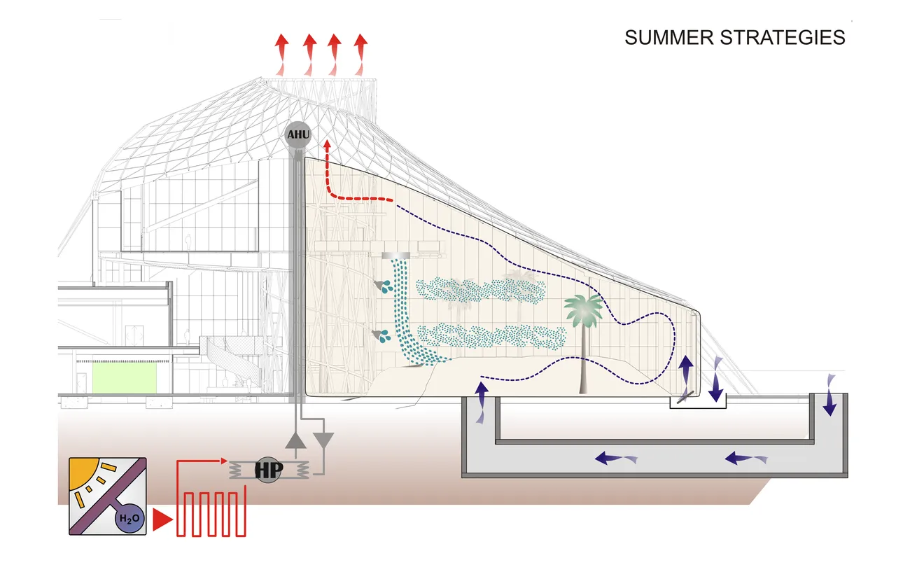 Wenn das Gewächshaus gekühlt oder entfeuchtet werden muss, wenn die Außenluft noch unter 0°C liegt, werden Erdkanäle mit Hilfe von Heizschlangen verwendet, um eine angemessene Vorlauftemperatur zu gewährleisten und die Luft, die von außen kommt, vorzuwärmen. Den Kühlbedarf im Sommer deckt natürliche Belüftung in Verbindung mit einem Nebelsystem, das neben der Verdunstungskühlung auch die Luftfeuchtigkeit in den Innenräumen kontrolliert.