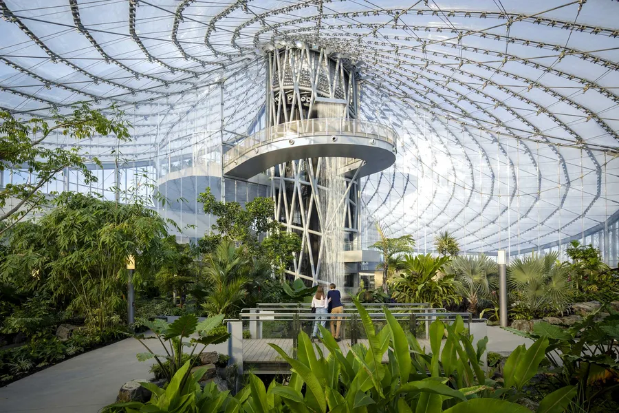 Die transparente Hülle schafft eine natürliche Umgebung, in der die Besucher ein exotisches Klima erleben können. Der Heizbedarf im Winter wird durch ein hydronisches Heizsystem für die Wurzeln reduziert, das über Nacht kühlere Innenlufttemperaturen ermöglicht.