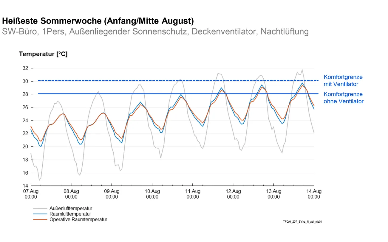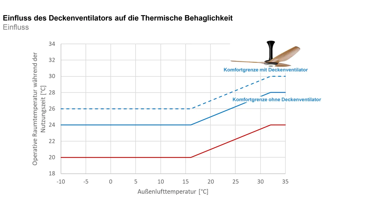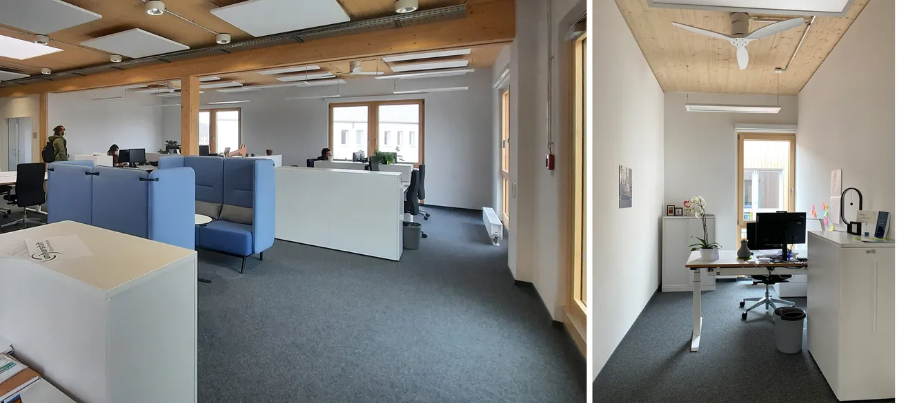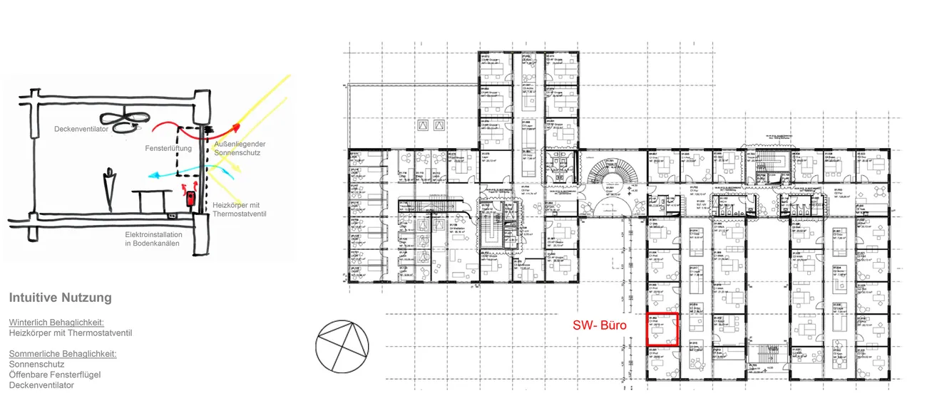 In den Büros gibt es Fensterlüftung, Heizkörper mit Thermostatventil, schaltbaren Sonnen- und Blendschutz. Deckenventilatoren erhöhen der Luftgeschwindigkeit im Sommer.