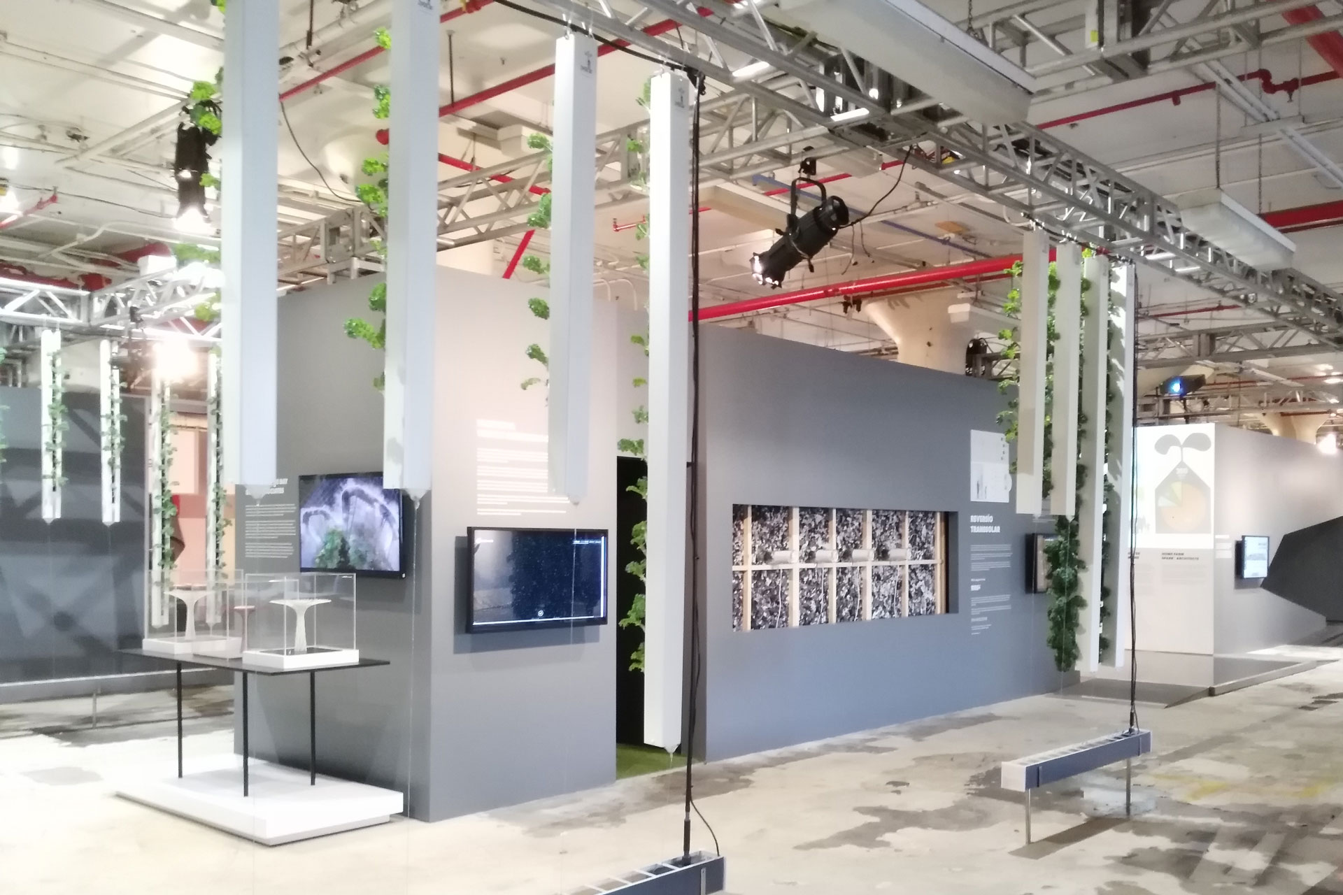 Das gesamte Konzept erforderte keine mechanische Kühlung. Auf innovativen, zu 100% aus recyceltem Material bestehenden Akustikabsorbern wuchsen Pflanzen, was die akustischen Eigenschaften des Raumes veränderte. Die Trockennebelventilatoren sorgten für Luftbewegung und Verdunstungskühlung, bei der die Lufttemperatur sinkt und gleichzeitig steigt die Luftfeuchtigkeit. Es ist ein kniffliger Balanceakt, Umgebung, Material und Licht durch passive Systeme so zu beeinflussen, dass die menschliche Empfindung ausgetrickst wird und dieser Wahrnehmungsraum entsteht, der es erlaubt, die Ausstellung einige Augenblicke lang gefühlt zu verlassen.