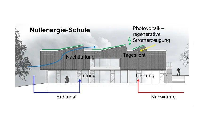 Eine sogenannte Schublüftung als Lüftungsanlage arbeitet mit einer etwa um zwei Drittel geringeren Luftgeschwindigkeit als üblich (ca. 1m/s, ca. 3kWh/qm/a). Das spart etwa 80% Energie gegenüber einer konventionellen Lüftung mit höheren Luftgeschwindigkeiten. Die Zuluft des Gebäudes durchströmt einen 45 Meter langen Erdkanal. Im Winter wärmt sich die Luft auf dem Weg in die Schule so um 5 Grad vor und wird im Sommer um 5 Grad kühler als die Außenluft.