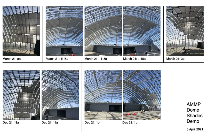 Last week Renzo Piano Building Workshop organized the “dome shade demo” in coordination with Draper Inc., the company in charge for the shading systems. With remote log in and manipulation of the time clock two indicative sun positions were simulated so the architects and planners could observe the shade positions and compare them to design and validate the programming.